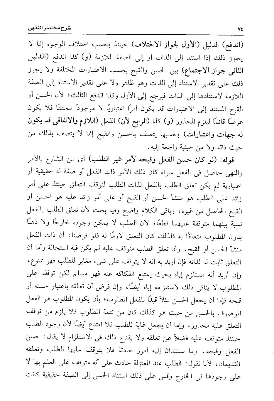 (اندفع) الدليل (الأول لجواز الاختلاف) حينئذ بحسب اختلاف الوجوه إنما لا يجوز ذلك إذا استند إلى الذات أو إلى الصفة اللازمة (و) كذا اندفع (الدليل الثانى جواز الاجتماع) بين الحسن والقبح بحسب الاعتبارات المختلفة ولا يجوز ذلك على تقدير الاستناد إلى الذات وهو ظاهر ولا على تقدير الاستناد إلى الصفة اللازمة لاستنادها إلى الذات فيرجع إلى الأول وكذا اندفع الثالث؛ لأن الحسن أو القبح المستند إلى الاعتبارات قد يكون أمرًا اعتباريًا لا موجودًا محققًا فلا يكون عرضًا قائمًا ليلزم المحذور (و) كذا (الرابع لأن) الفعل (اللازم والاتفاقى قد يكون له جهات واعتبارات) بحسبها يتصف بالحسن والقبح إنما لا يتصف بذلك من حيث ذاته ولا من حيثية راجعة إليه.