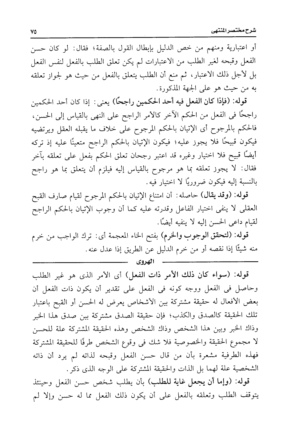 أو اعتبارية ومنهم من خص الدليل بإبطال القول بالصفة؛ فقال: لو كان حسن الفعل وقبحه لغير الطلب من الاعتبارات لم يكن تعلق الطلب بالفعل لنفس الفعل بل لأجل ذلك الاعتبار، ثم منع أن الطلب يتعلق بالفعل من حيث هو لجواز تعلقه به من حيث هو على الجهة المذكورة.