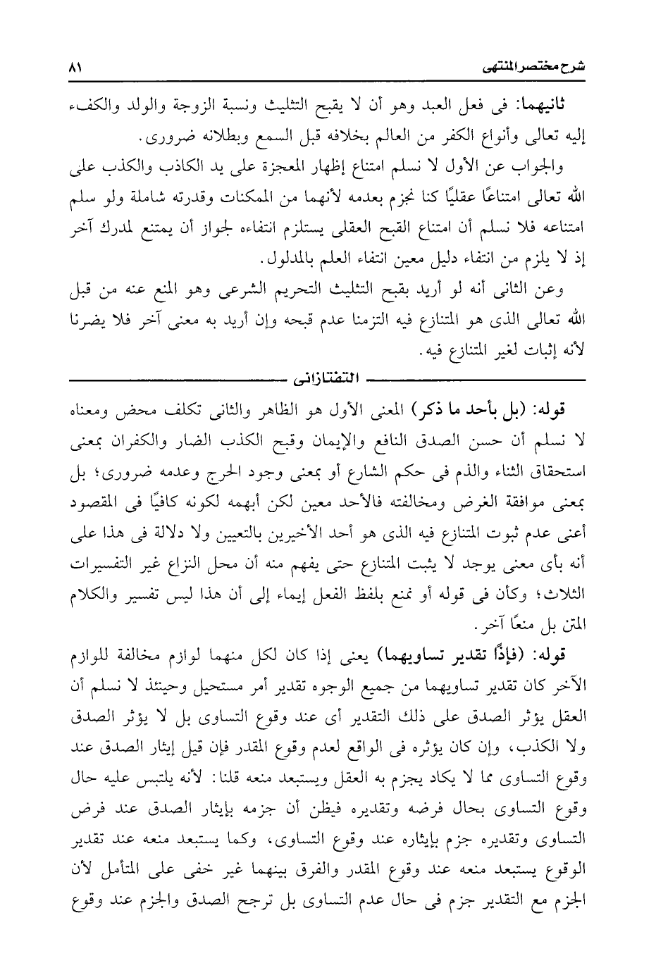 قوله: (فإذًا تقدير تساويهما) يعنى إذا كان لكل منهما لوازم مخالفة للوازم الآخر كان تقدير تساويهما من جميع الوجوه تقدير أمر مستحيل وحينئذ لا نسلم أن العقل يؤثر الصدق على ذلك التقدير أى عند وقوع التساوى بل لا يؤثر الصدق ولا الكذب، وإن كان يؤثره فى الواقع لعدم وقوع المقدر فإن قيل إيثار الصدق عند وقوع التساوى مما لا يكاد يجزم به العقل ويستبعد منعه قلنا: لأنه يلتبس عليه حال وقوع التساوى بحال فرضه وتقديره فيظن أن جزمه بإيثار الصدق عند فرض التساوى وتقديره جزم بإيثاره عند وقوع التساوى، وكما يستبعد منعه عند تقدير الوقوع يستبعد منعه عند وقوع المقدر والفرق بينهما غير خفى على المتأمل لأن الجزم مع التقدير جزم فى حال عدم التساوى بل نرجح الصدق والجزم عند وقوع