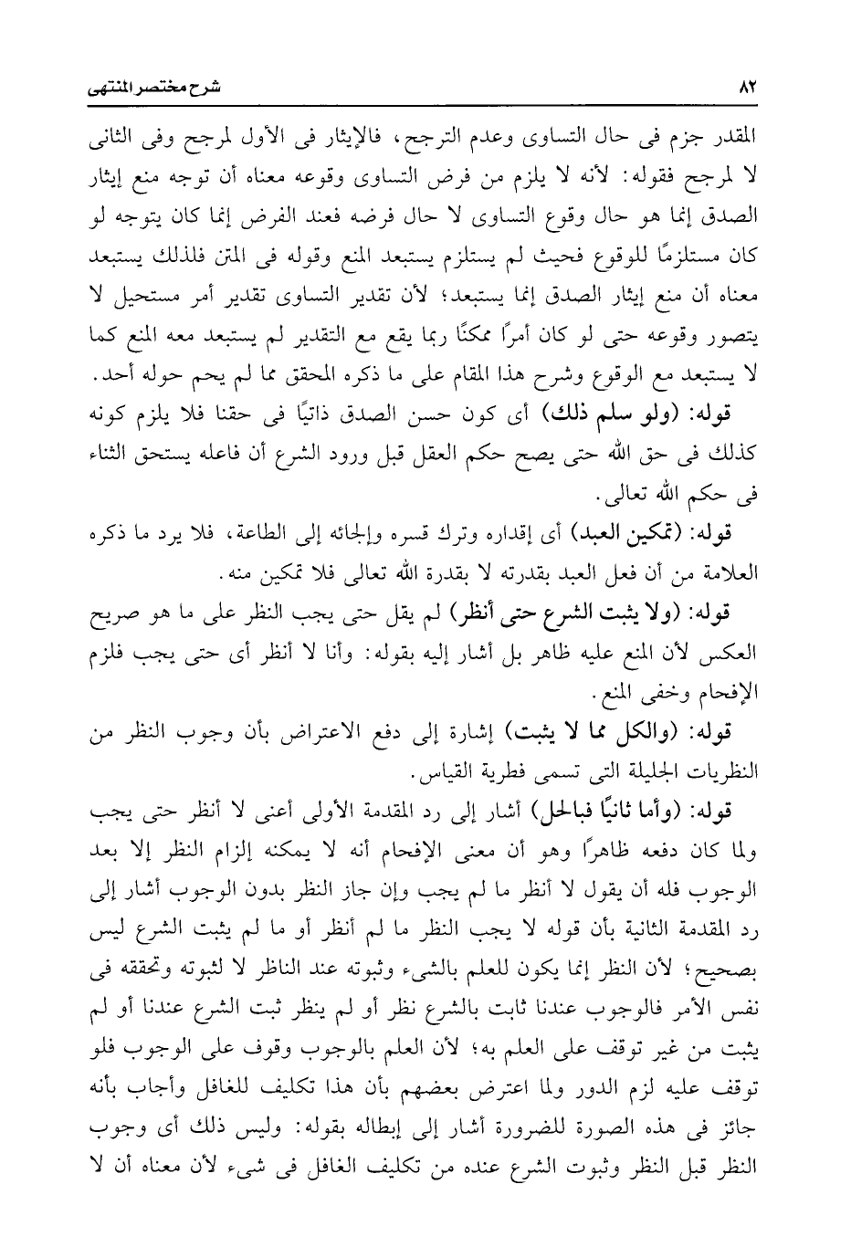 قوله: (وأما ثانيًا فبالحل) أشار إلى رد المقدمة الأولى أعنى لا أنظر حتى يجب ولما كان دفعه ظاهرًا وهو أن معنى الإفحام أنه لا يمكنه إلزام النظر إلا بعد الوجوب فله أن يقول لا أنظر ما لم يجب وإن جاز النظر بدون الوجوب أشار إلى رد المقدمة الثانية بأن قوله لا يجب النظر ما لم أنظر أو ما لم يثبت الشرع ليس بصحيح؛ لأن النظر إنما يكون للعلم بالشئ وثبوته عند الناظر لا لثبوته وتحققه فى نفس الأمر فالوجوب عندنا ثابت بالشرع نظر أو لم ينظر ثبت الشرع عندنا أو لم يثبت من غير توقف على العلم به؛ لأن العلم بالوجوب وقوف على الوجوب فلو توقف عليه لزم الدور ولما اعترض بعضهم بأن هذا تكليف للغافل وأجاب بأنه جائز فى هذه الصورة للضرورة أشار إلى إبطاله بقوله: وليس ذلك أى وجوب النظر قبل النظر وثبوت الشرع عنده من تكليف الغافل فى شئ لأن معناه أن لا