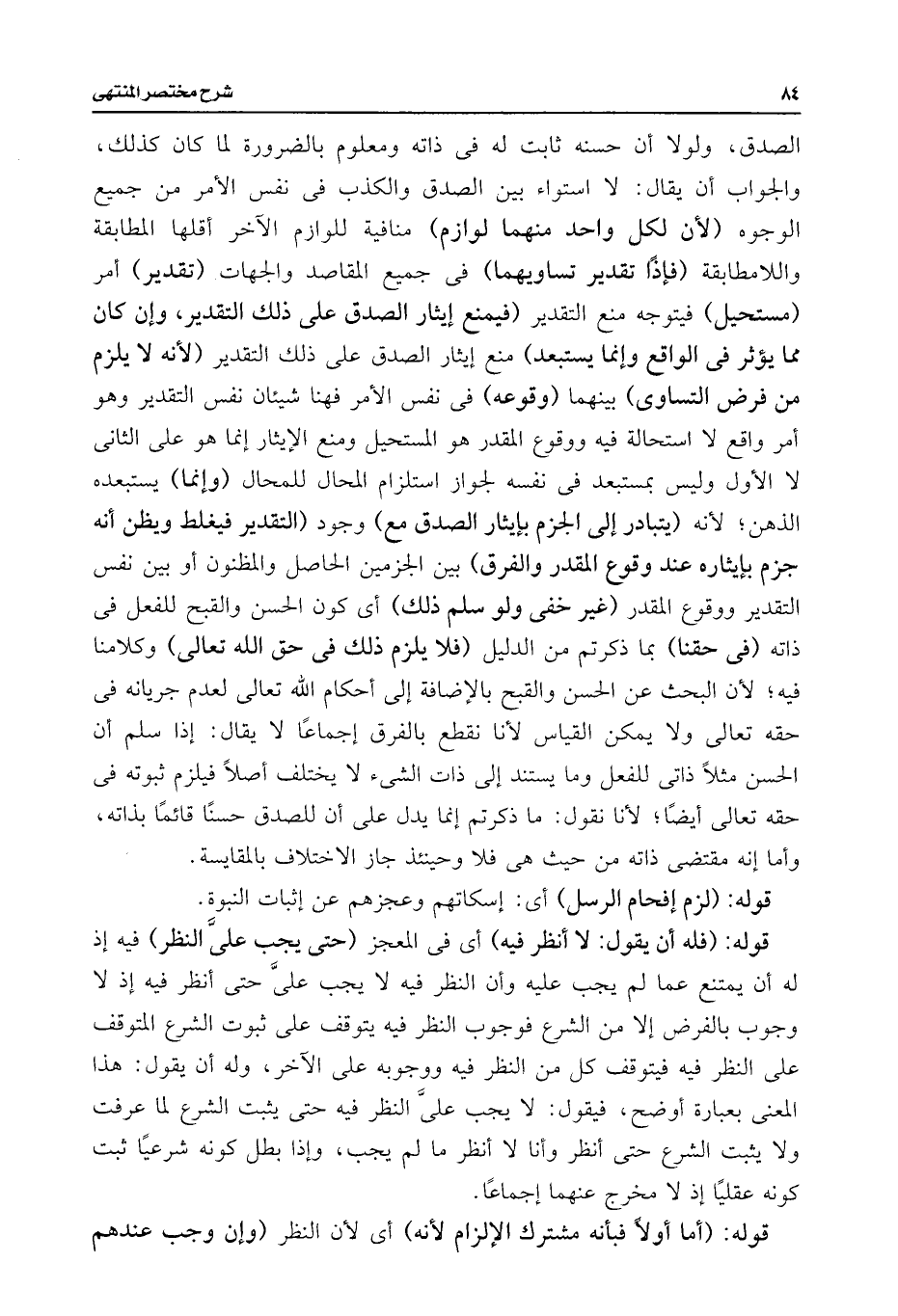 الصدق، ولولا أن حسنه ثابت له فى ذاته ومعلوم بالضرورة لما كان كذلك، والجواب أن يقال: لا استواء بين الصدق والكذب فى نفسر الأمر من جميع الوجوه (لأن لكل واحد منهما لوازم) منافية للوازم الآخر أقلها المطابقة واللامطابقة (فإذًا تقدير تساويهما) فى جميع المقاصد والجهات (تقدير) أمر (مستحيل) فيتوجه منع التقدير (فيمنع إيثار الصدق على ذلك التقدير، وإن كان مما يؤثر فى الواقع وإنما يستبعد) منع إيثار الصدق على ذلك التقدير (لأنه لا يلزم من فرض التساوى) بينهما (وقوعه) فى نفس الأمر فهنا شيئان نفس التقدير وهو أمر واقع لا استحالة فيه ووقوع المقدر هو المستحيل ومنع الإيثار إنما هو على الثانى لا الأول وليس بمستبعد فى نفسه لجواز استلزام المحال للمحال (وإنما) يستبعده الذهن؛ لأنه (يتبادر إلى الجزم بإيثار الصدق مع) وجود (التقدير فيغلط ويظن أنه جزم بإيثاره عند وقوع المقدر والفرق) بين الجزمين الحاصل والمظنون أو بين نفس التقدير ووقوع المقدر (غير خفى ولو سلم ذلك) أى كون الحسن والقبح للفعل فى ذاته (فى حقنا) بما ذكرتم من الدليل (فلا يلزم ذلك فى حق اللَّه تعالى) وكلامنا فيه؛ لأن البحث عن الحسن والقبح بالإضافة إلى أحكام اللَّه تعالى لعدم جريانه فى حقه تعالى ولا يمكن القياس لأنا نقطع بالفرق إجماعًا لا يقال: إذا سلم أن الحسن مثلًا ذاتى للفعل وما يستند إلى ذات الشئ لا يختلف أصلًا فيلزم ثبوته فى حقه تعالى أيضًا، لأنا نقول: ما ذكرتم إنما يدل على أن للصدق حسنًا قائمًا بذاته، وأما إنه مقتضى ذاته من حيث هى فلا وحينئذ جاز الاختلاف بالمقايسة.