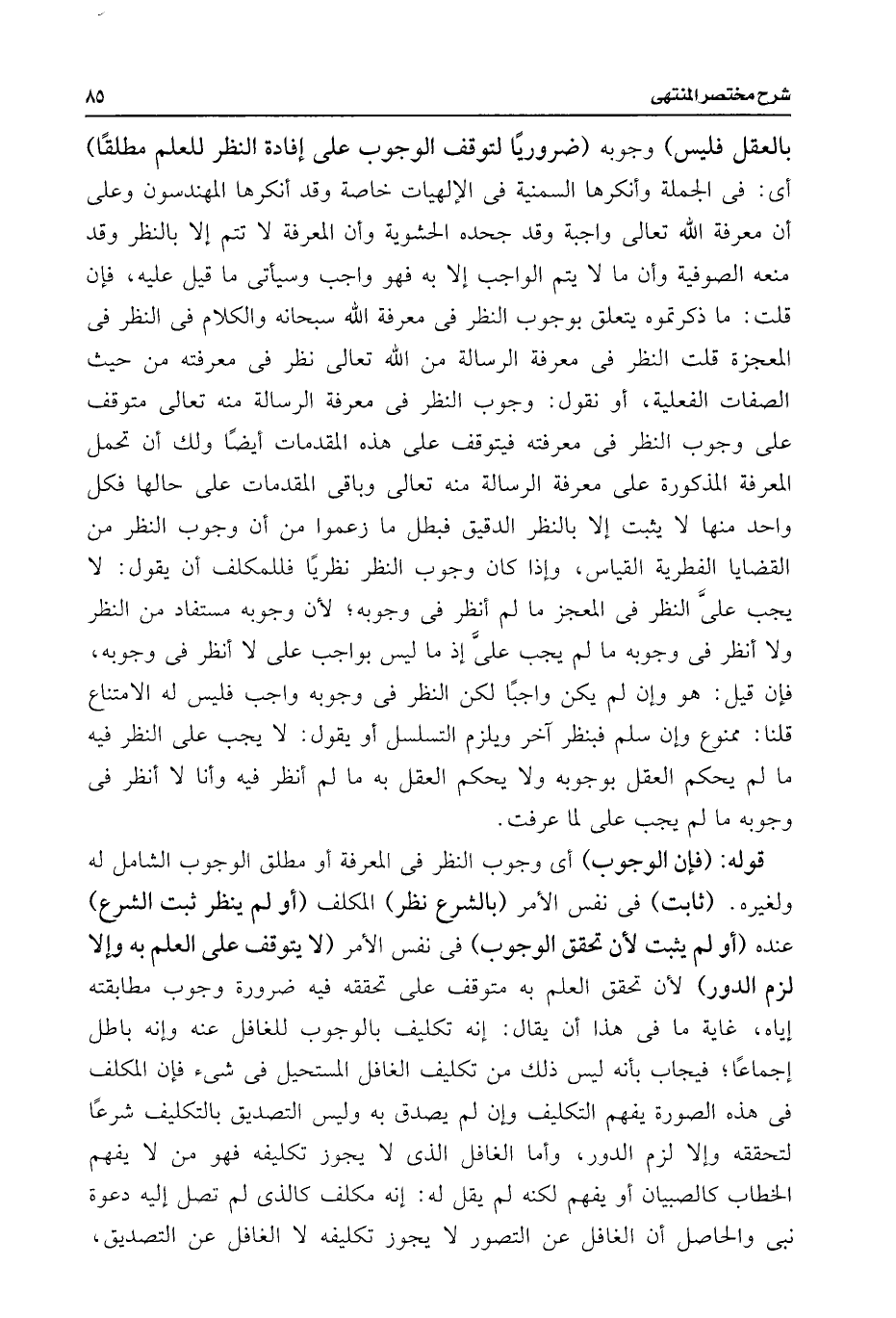 بالعقل فليس) وجوبه (ضروريًا لتوقف الوجوب على إفادة النظر للعلم مطلقًا) أى: فى الجملة وأنكرها السمنية فى الإلهيات خاصة وقد أنكرها المهندسون وعلى أن معرفة اللَّه تعالى واجبة وقد جحده الحشوية وأن المعرفة لا تتم إلا بالنظر وقد منعه الصوفية وأن ما لا يتم الواجب إلا به فهو واجب وسيأتى ما قيل عليه، فإن قلت: ما ذكرتموه يتعلق بوجوب النظر فى معرفة اللَّه سبحانه والكلام فى النظر فى المعجزة قلت النظر فى معرفة الرسالة من اللَّه تعالى نظر فى معرفته من حيث الصفات الفعلية، أو نقول: وجوب النظر فى معرفة الرسالة منه تعالى متوقف على وجوب النظر فى معرفته فيتوقف على هذه المقدمات أيضًا ولك أن تحمل المعرفة المذكورة على معرفة الرسالة منه تعالى وباقى المقدمات على حالها فكل واحد منها لا يثبت إلا بالنظر الدقيق فبطل ما زعموا من أن وجوب النظر من القضايا الفطرية القياس، وإذا كان وجوب النظر نظريًا فللمكلف أن يقول: لا يجب علىَّ النظر فى المعجز ما لم أنظر فى وجوبه؛ لأن وجوبه مستفاد من النظر ولا أنظر فى وجوبه ما لم يجب علىَّ إذ ما ليس بواجب على لا أنظر فى وجوبه، فإن قيل: هو وإن لم يكن واجبًا لكن النظر فى وجوبه واجب فليس له الامتناع قلنا: ممنوع وإن سلم فبنظر آخر ويلزم التسلسل أو يقول: لا يجب على النظر فيه ما لم يحكم العقل بوجوبه ولا يحكم العقل به ما لم أنظر فيه وأنا لا أنظر فى وجوبه ما لم يجب على لما عرفت.