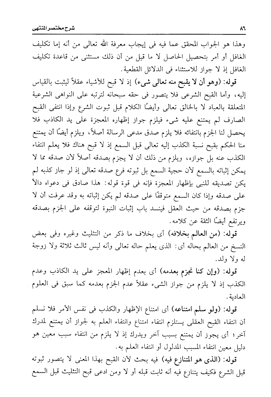 قوله: (وهو أن لا يقبح منه تعالى شئ) إذ لا قبح للأشياء عقلًا ليثبت بالقياس إليه، وأما القبح الشرعى فلا يتصور فى حقه سبحانه لترتبه على النواهى الشرعية المتعلقة بالعباد لا بالخالق تعالى وأيضًا الكلام قبل ثبوت الشرع وإذا انتفى القبح الصارف لم يمتنع عليه شئ فيلزم جواز إظهاره المعجزة على يد الكاذب فلا يحصل لنا الجزم بانتفائه فلا يلزم صدق مدعى الرسالة أصلًا، ويلزم أيضًا أن يمتنع منا الحكم بقبح نسبة الكذب إليه تعالى قبل السمع إذ لا قبح هناك فلا يعلم انتفاء الكذب عنه بل جوازه، ويلزم من ذلك أن لا يجزم بصدقه أصلًا لأن صدقه مما لا يمكن إثباته بالسمع لأن حجية السمع بل ثبوته فرع صدقه تعالى إذ لو جاز كذبه لم يكن تصديقه للنبى بإظهار المعجزة فإنه فى قوة قوله: هذا صادق فى دعواه دالًا على صدقه وإذا كان السمع متوقفًا على صدقه لم يكن إثباته به وقد عرفت أن لا جزم بصدقه من حيث العقل فينسد باب إثبات النبوة لتوقفه على الجزم بصدقه ويرتفع أيضًا الثقة عن كلامه.