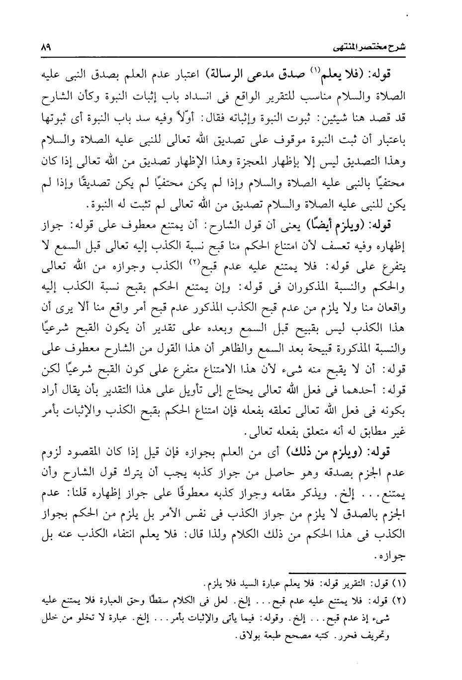 قوله: (ويلزم أيضًا) يعنى أن قول الشارح: أن يمتنع معطوف على قوله: جواز إظهاره وفيه تعسف لأن امتناع الحكم منا قبح نسبة الكذب إليه تعالى قبل السمع لا يتفرع على قوله: فلا يمتنع عليه عدم قبح (¬٢) الكذب وجوازه من اللَّه تعالى والحكم والنسبة المذكوران فى قوله: وإن يمتنع الحكم بقبح نسبة الكذب إليه واقعان منا ولا يلزم من عدم قبح الكذب المذكور عدم قبح أمر واقع منا ألا يرى أن هذا الكذب ليس بقبيح قبل السمع وبعده على تقدير أن يكون القبح شرعيًا والنسبة المذكورة قبيحة بعد السمع والظاهر أن هذا القول من الشارح معطوف على قوله: أن لا يقبح منه شئ لأن هذا الامتناع متفرع على كون القبح شرعيًا لكن قوله: أحدهما فى فعل اللَّه تعالى يحتاج إلى تأويل على هذا التقدير بأن يقال أراد بكونه فى فعل اللَّه تعالى تعلقه بفعله فإن امتناع الحكم بقبح الكذب والإثبات بأمر غير مطابق له أنه متعلق بفعله تعالى.