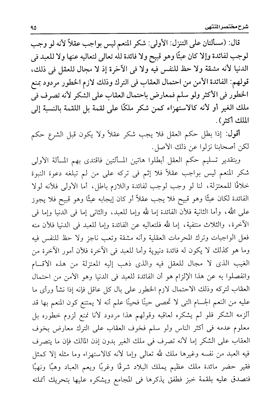 قال: (مسألتان على التنزل: الأولى: شكر المنعم ليس بواجب عقلًا لأنه لو وجب لوجب لفائدة وإلا كان عبثًا وهو قبيح ولا فائدة للَّه تعالى لتعاليه عنها ولا للعبد فى الدنيا لأنه مشقة ولا حظ للنفس فيه ولا فى الآخرة إذ لا مجال للعقل فى ذلك، قولهم: الفائدة الأمن من احتمال العقاب فى الترك وذلك لازم الخطور مردود بمنع الخطور فى الأكثر ولو سلم فمعارض باحتمال العقاب على الشكر لأنه تصرف فى ملك الغير أو لأنه كالاستهزاء كمن شكر ملكًا على لقمة بل اللقمة بالنسبة إلى الملك أكثر).