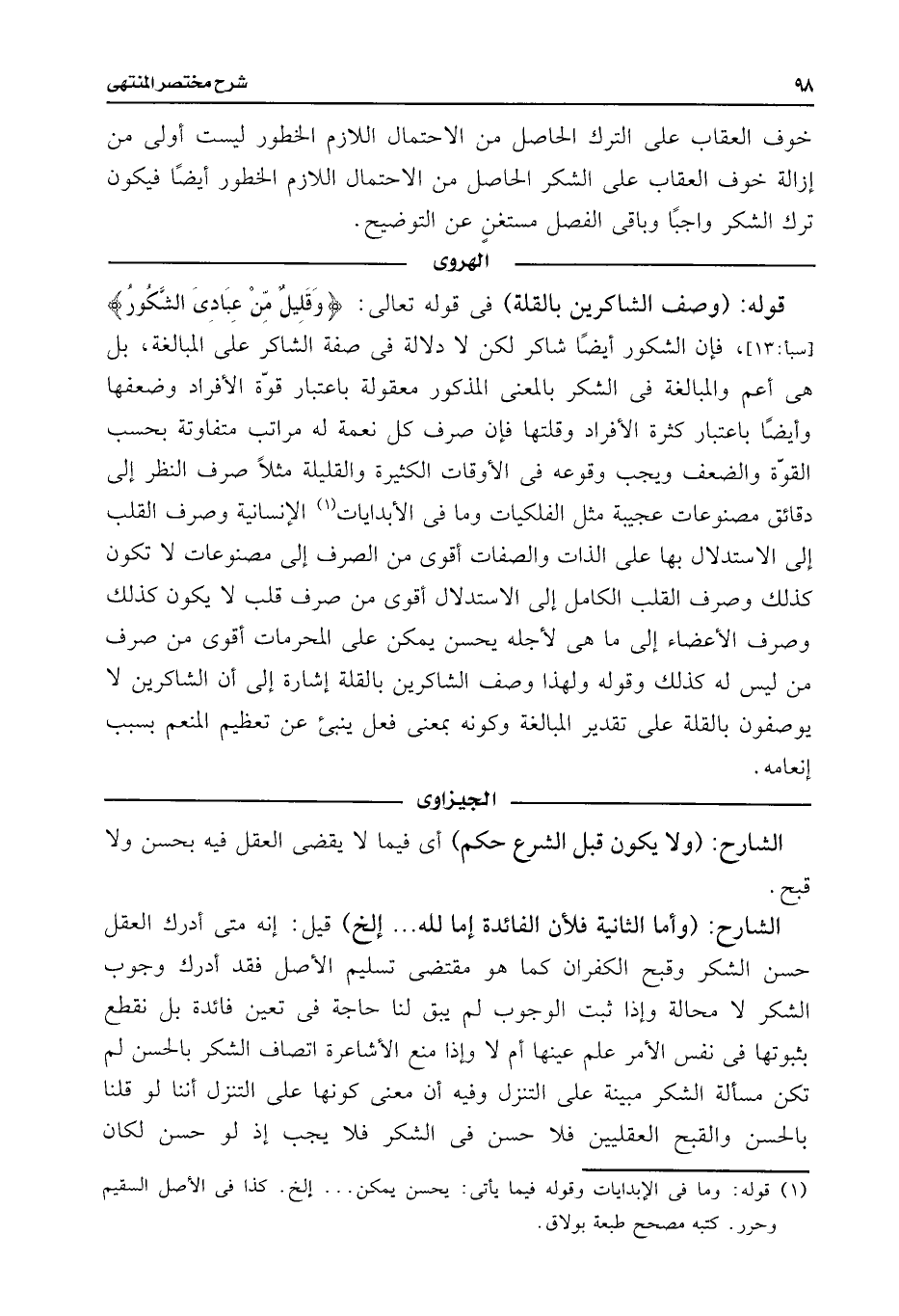 قوله: (وصف الشاكرين بالقلة) فى قوله تعالى: {وَقَلِيلٌ مِنْ عِبَادِيَ الشَّكُورُ} [سبأ: ١٣]، فإن الشكور أيضًا شاكر لكن لا دلالة فى صفة الشاكر على المبالغة، بل هى أعم والمبالغة فى الشكر بالمعنى المذكور معقولة باعتبار قوّة الأفراد وضعفها وأيضًا باعتبار كثرة الأفراد وقلتها فإن صرف كل نعمة له مراتب متفاوتة بحسب القوّة والضعف ويجب وقوعه فى الأوقات الكثيرة والقليلة مثلًا صرف النظر إلى دقائق مصنوعات عجيبة مثل الفلكيات وما فى الأبدايات (¬١) الإنسانية وصرف القلب إلى الاستدلال بها على الذات والصفات أقوى من الصرف إلى مصنوعات لا تكون كذلك وصرف القلب الكامل إلى الاستدلال أقوى من صرف قلب لا يكون كذلك وصرف الأعضاء إلى ما هى لأجله يحسن يمكن على المحرمات أقوى من صرف من ليس له كذلك وقوله ولهذا وصف الشاكرين بالقلة إشارة إلى أن الشاكرين لا يوصفون بالقلة على تقدير المبالغة وكونه بمعنى فعل ينبئ عن تعظيم المنعم بسبب إنعامه.