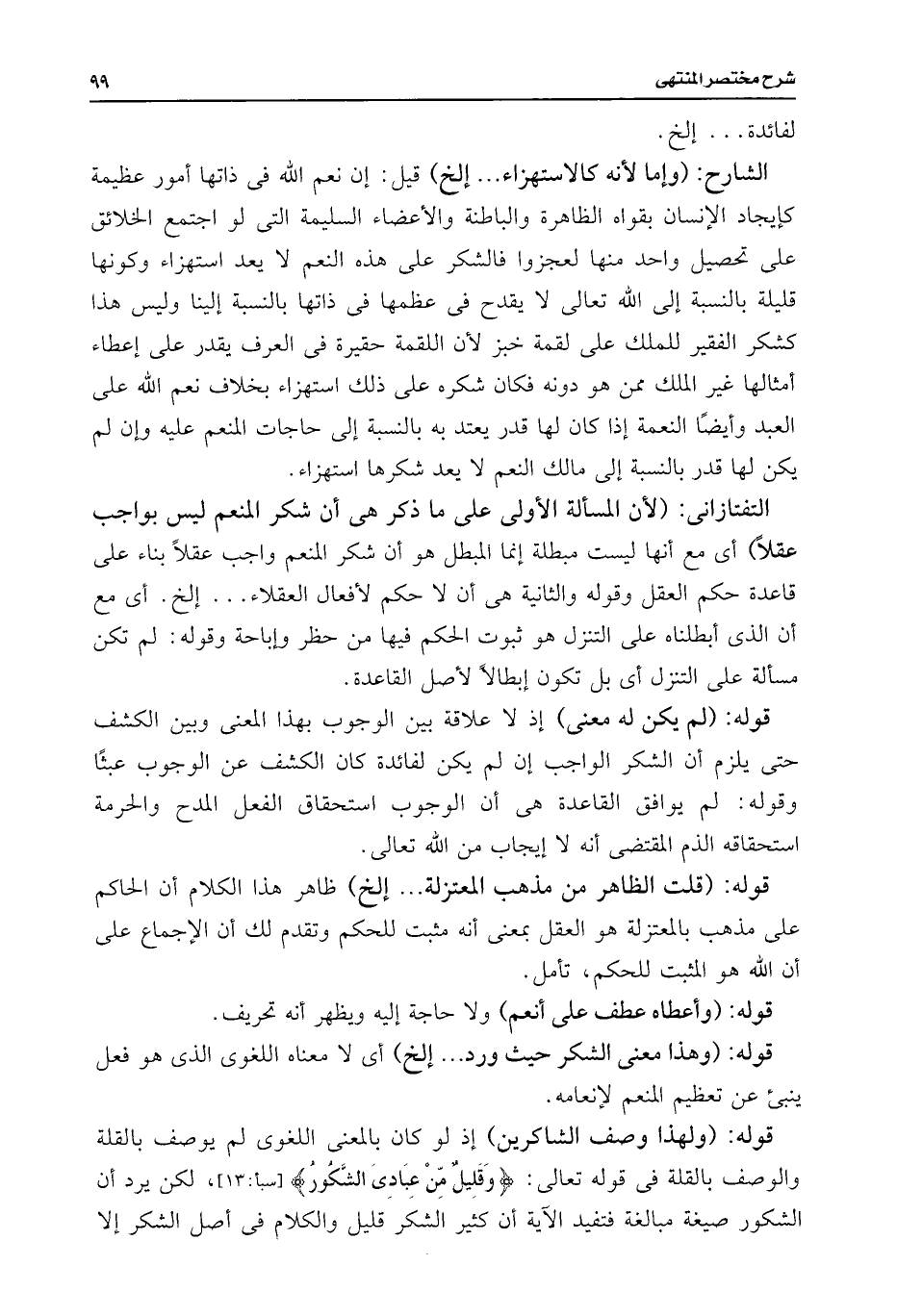 قوله: (ولهذا وصف الشاكرين) إذ لو كان بالمعنى اللغوى لم يوصف بالقلة والوصف بالقلة فى قوله تعالى: {وَقَلِيلٌ مِنْ عِبَادِيَ الشَّكُورُ} [سبأ: ١٣]، لكن يرد أن الشكور صيغة مبالغة فتفيد الآية أن كثير الشكر قليل والكلام فى أصل الشكر إلا