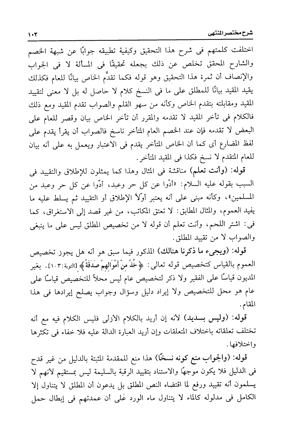 اختلفت كلمتهم فى شرح هذا التحقيق وكيفية تطبيقه جوابًا عن شبهة الخصم والشارح المحقق تخلص عن ذلك بجعله تحقيقًا فى المسألة لا فى الجواب والإنصاف أن ثمرة هذا التحقيق وهو قوله فكما تقدَّم الخاص بيانًا للعام فكذلك يقيد المقيد بيانًا للمطلق على ما فى النسخ كلام لا حاصل له بل لا معنى لتقييد المقيد ومقابلته بتقدم الخاص وكأنه من سهو القلم والصواب تقدم المقيد ومع ذلك فالكلام فى تأخر المقيد لا تقدمه والمقرر أن تأخر الخاص بيان وقصر للعام على البعض لا تقدمه فإن عند الخصم العام المتأخر ناسخ فالصواب أن يقرأ يقدم على لفظ المضارع أى كما أن الخاص المتأخر يقدم فى الاعتبار ويعمل به على أنه بيان للعام المتقدم لا نسخ فكذا فى المقيد المتأخر.