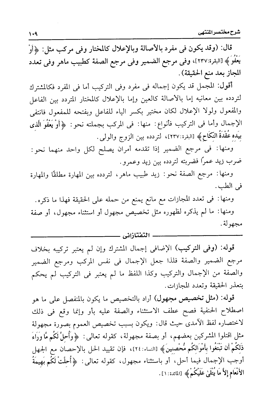 أقول: المجمل قد يكون إجماله فى مفرد وفى التركيب أما فى المفرد فكالمشترك لتردده بين معانيه إما بالأصالة كالعين وإما بالإعلال كالمختار المتردد بين الفاعل والمفعول ولولا الإعلال لكان مختير بكسر الياء للفاعل وبفتحه للمفعول فانتفى الإجمال وأما فى التركيب فأنواع: منها: فى المركب بجملته نحو: {أَوْ يَعْفُوَ الَّذِي بِيَدِهِ عُقْدَةُ النِّكَاحِ} [البقرة: ٢٣٧]، لتردده بين الزوج والولى.