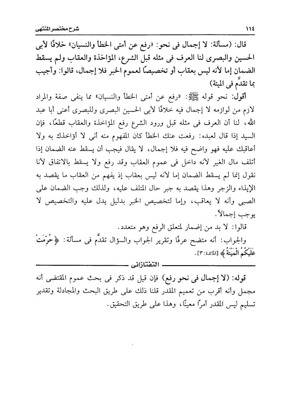 أقول: نحو قوله -صلى اللَّه عليه وسلم-: "رفع عن أمتى الخطأ والنسيان" مما ينفى صفة والمراد لازم من لوازمه لا إجمال فيه خلافًا لأبى الحسين البصرى وللبصرى أعنى أبا عبد اللَّه، لنا أن العرف فى مثله قبل ورود الشرع رفع المؤاخذة والعقاب قطعًا، فإن السيد إذا قال لعبده: رفعت عنك الخطأ كان المفهوم منه أنى لا أؤاخذك به ولا أعاقبك عليه فهو واضح فيه فلا إجمال، لا يقال فيجب أن يسقط عنه الضمان إذا أتلف مال الغير لأنه داخل فى عموم العقاب وقد رفع ولا يسقط بالاتفاق لأنا نقول إنما لم يسقط الضمان إما لأنه ليس بعقاب إذ يفهم من العقاب ما يقصد به الإيذاء والزجر وهذا يقصد به جبر حال المتلف عليه، ولذلك وجب الضمان على الصبى وأنه لا يعاقب، وإما لتخصيص الخبر بدليل يدل عليه والتخصيص لا يوجب إجمالًا.