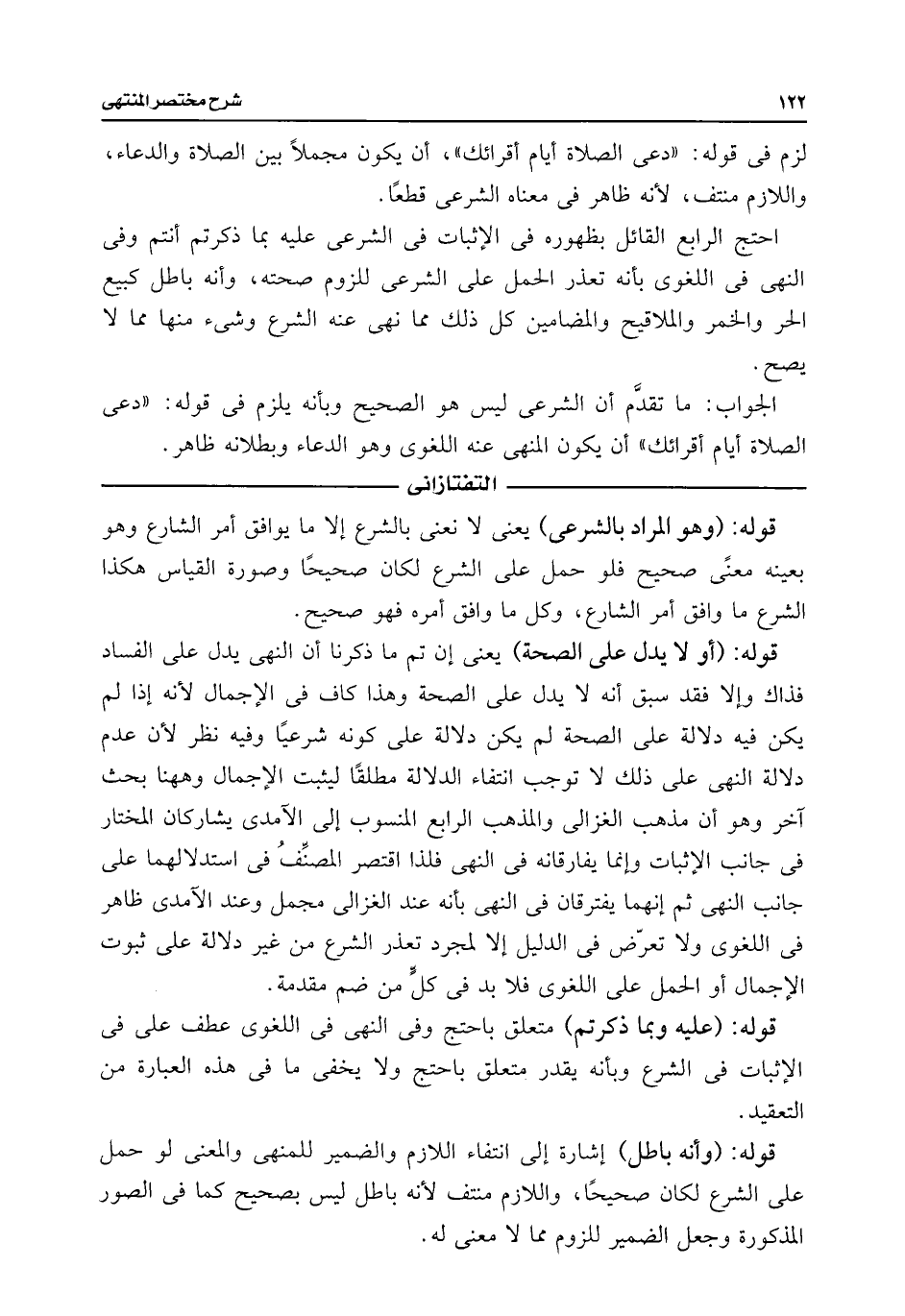 الجواب: ما تقدَّم أن الشرعى ليس هو الصحيح وبأنه يلزم فى قوله: "دعى الصلاة أيام أقرائك" أن يكون النهى عنه اللغوى وهو الدعاء وبطلانه ظاهر.