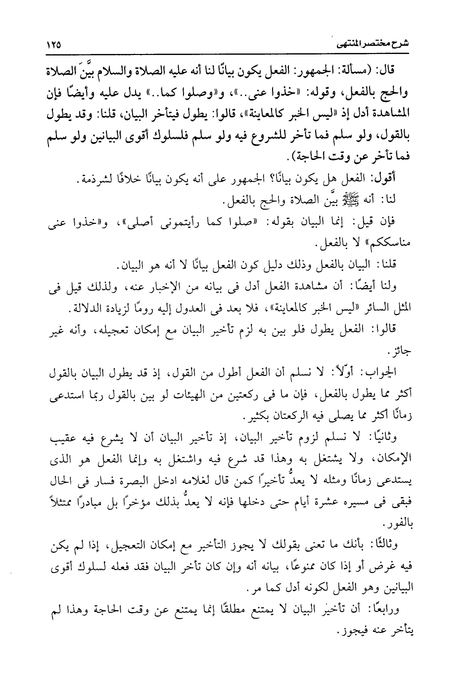 وثانيًا: لا نسلم لزوم تأخير البيان، إذ تأخير البيان أن لا يشرع فيه عقيب الإمكان، ولا يشتغل به وهذا قد شرع فيه واشتغل به وإنما الفعل هو الذى يستدعى زمانًا ومثله لا يعدُّ تأخيرًا كمن قال لغلامه ادخل البصرة فسار فى الحال فبقى فى مسيره عشرة أيام حتى دخلها فإنه لا يعدُّ بذلك مؤخرًا بل مبادرًا ممتثلًا بالفور.