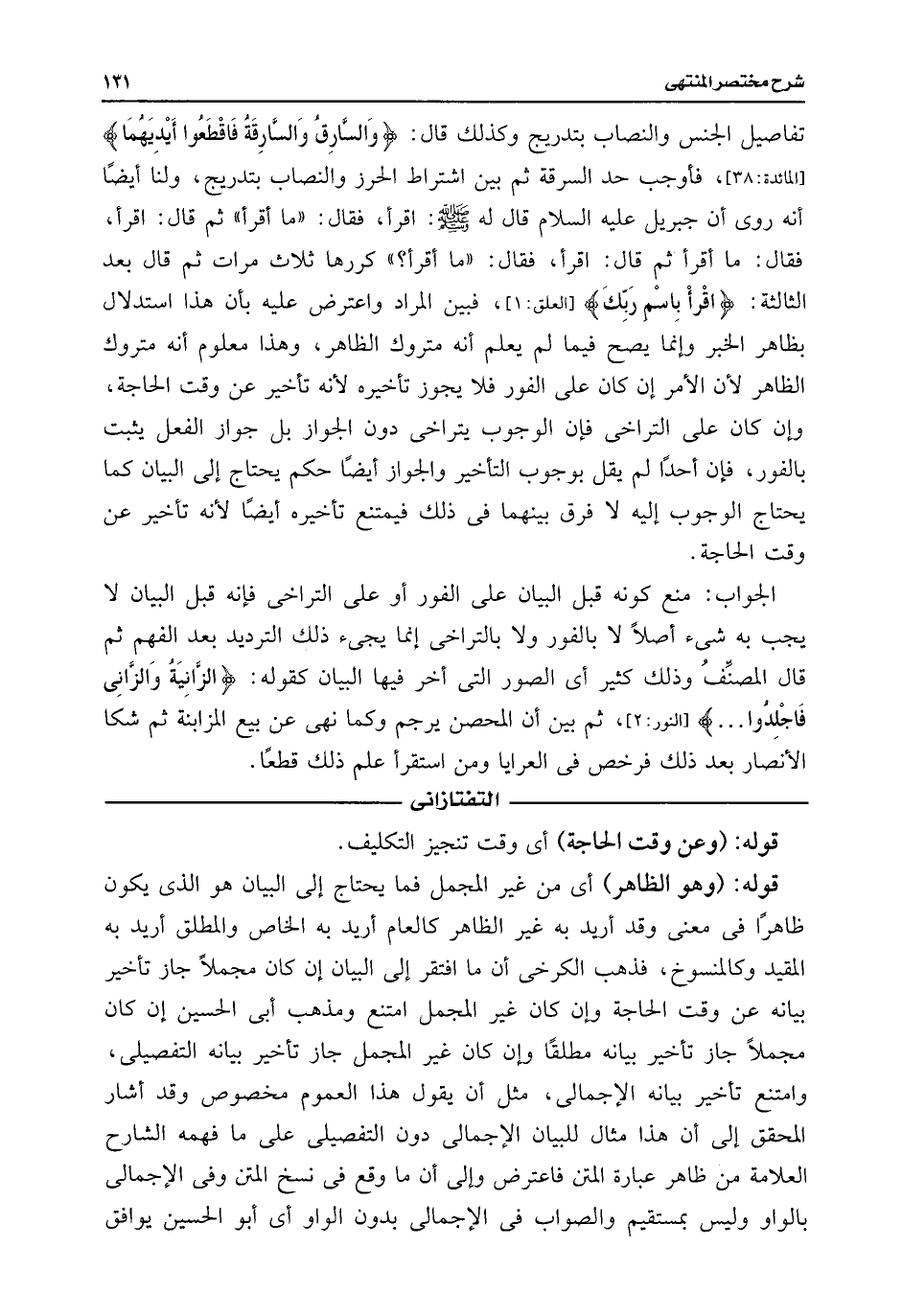 تفاصيل الجنس والنصاب بتدريج وكذلك قال: {وَالسَّارِقُ وَالسَّارِقَةُ فَاقْطَعُوا أَيْدِيَهُمَا} [المائدة: ٣٨]، فأوجب حد السرقة ثم بين اشتراط الحرز والنصاب بتدريج، ولنا أيضًا أنه روى أن جبريل عليه السلام قال له -صلى اللَّه عليه وسلم-: اقرأ، فقال: "ما أقرأ" ثم قال: اقرأ، فقال: ما أقرأ ثم قال: اقرأ، فقال: "ما أقرأ؟ " كررها ثلاث مرات ثم قال بعد الثالثة: {اقْرَأْ بِاسْمِ رَبِّكَ} [العلق: ١]، فبين المراد واعترض عليه بأن هذا استدلال بظاهر الخبر وإنما يصح فيما لم يعلم أنه متروك الظاهر، وهذا معلوم أنه متروك الظاهر لأن الأمر إن كان على الفور فلا يجوز تأخيره لأنه تأخير عن وقت الحاجة، وإن كان على التراخى فإن الوجوب يتراخى دون الجواز بل جواز الفعل يثبت بالفور، فإن أحدًا لم يقل بوجوب التأخير والجواز أيضًا حكم يحتاج إلى البيان كما يحتاج الوجوب إليه لا فرق بينهما فى ذلك فيمتنع تأخيره أيضًا لأنه تأخير عن وقت الحاجة.