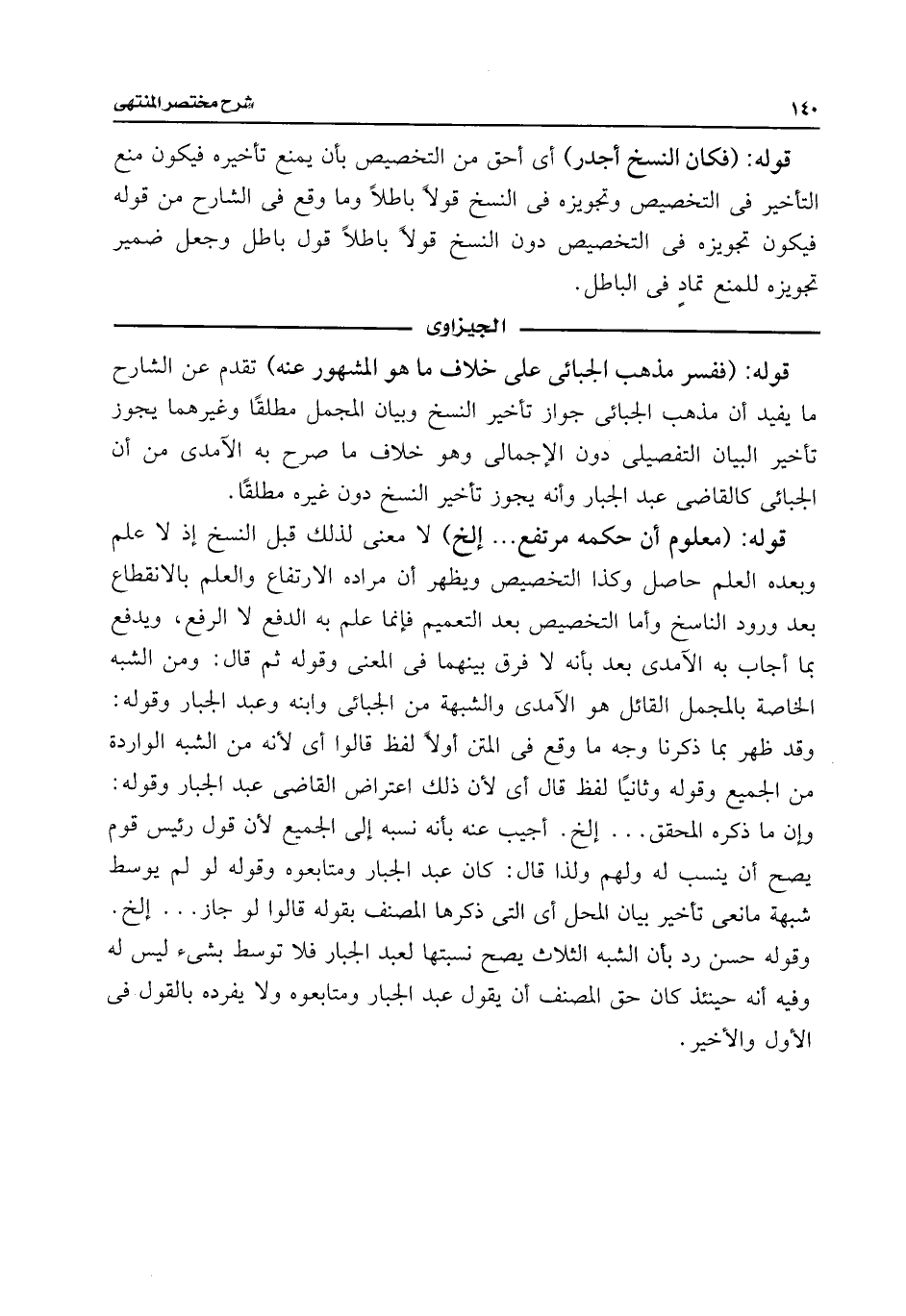 قوله: (ففسر مذهب الجبائى على خلاف ما هو المشهور عنه) تقدم عن الشارح ما يفيد أن مذهب الجبائى جواز تأخير النسخ وبيان المجمل مطلقًا وغيرهما يجوز تأخير البيان التفصيلى دون الإجمالى وهو خلاف ما صرح به الآمدى من أن الجبائى كالقاضى عبد الجبار وأنه يجوز تأخير النسخ دون غيره مطلقًا.