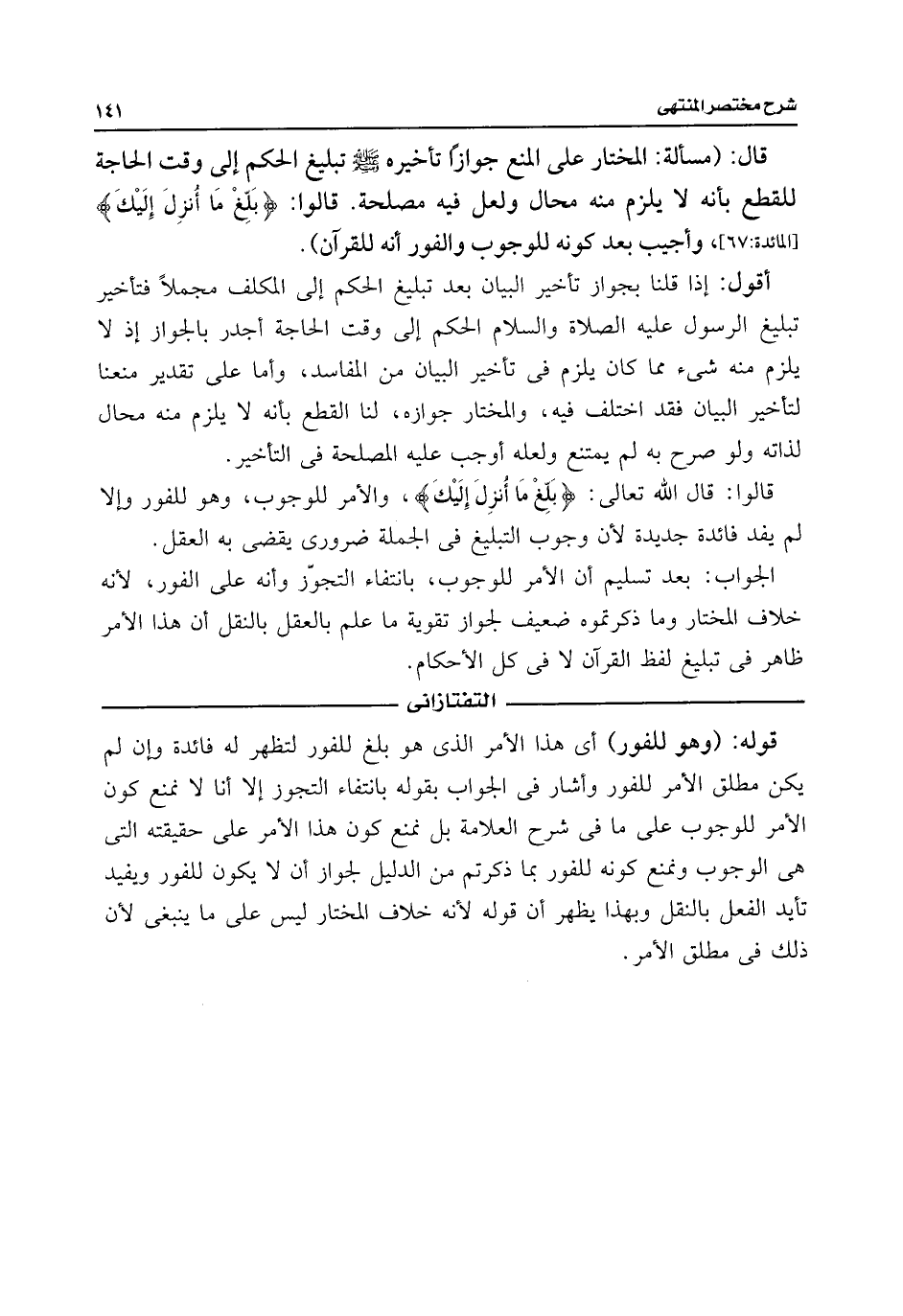 قال: (مسألة: المختار على المنع جوازًا تأخيره -صلى اللَّه عليه وسلم- تبليغ الحكم إلى وقت الحاجة للقطع بأنه لا يلزم منه محال ولعل فيه مصلحة. قالوا: {بَلِّغْ مَا أُنْزِلَ إِلَيْكَ} [المائدة: ٦٧]، وأجيب بعد كونه للوجوب والفور أنه للقرآن).