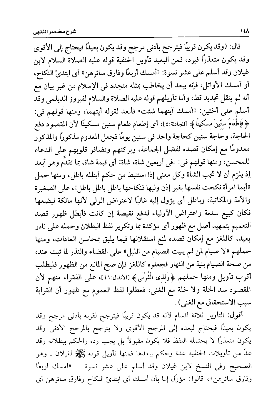 أقول: التأويل ثلاثة أقسام لأنه قد يكون قريبًا فيترجح لقربه بأدنى مرجح وقد يكون بعيدًا فيحتاج لبعده إلى المرجح الأقوى ولا يترجح بالمرجح الأدنى وقد يكون متعذرًا لا يحتمله اللفظ فلا يكون مقبولًا بل يجب رده والحكم ببطلانه وقد عدّ من تأويلات الحنفية عدة وحكم ببعدها فمنها تأويل قوله -صلى اللَّه عليه وسلم- لغيلان -وهو الصحيح وفى النسخ لابن غيلان وقد أسلم على عشر نسوة-: "أمسك أربعًا وفارق سائرهن"، قالوا: مؤوّل إما بأن أمسك أى ابتدئ النكاح وفارق سائرهن أى