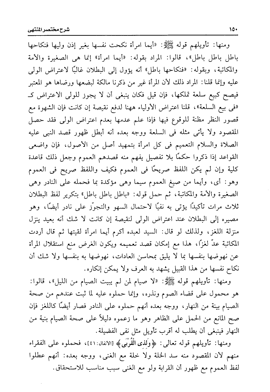 ومنها: تأويلهم قوله -صلى اللَّه عليه وسلم-: "أيما امرأة نكحت نفسها بغير إذن وليها فنكاحها باطل باطل باطل"، قالوا: المراد بقوله: "أيما امرأة" إنما هى الصغيرة والأمة والمكاتبة، وبقوله: "فنكاحها باطل" أنه يؤول إلى البطلان غالبًا لاعتراض الولى عليه وإنما قلنا: المراد ذلك لأن المرأة غير من ذكرنا مالكة لبضعها ورضاها هو المعتبر فيصح كبيع سلعة تملكها، فإن قيل فكان ينبغى أن لا يجوز للولى الاعتراض كـ "فى بيع السلعة"، قلنا اعتراض الأولياء ههنا لدفع نقيصة إن كانت فإن الشهوة مع قصور النظر مظنة للوقوع فيها فإذا علم عدمها بعدم اعتراض الولى فقد حصل المقصود ولا يأتى مثله فى السلعة ووجه بعده أنه أبطل ظهور قصد النبى عليه الصلاة والسلام التعميم فى كل امرأة بتمهيد أصل من الأصول، فإن واضعى القواعد إذا ذكروا حكمًا بلا تفصيل يفهم منه قصدهم العموم وجعل ذلك قاعدة كلية وإن لم يكن اللفظ صريحًا فى العموم فكيف واللفظ صريح فى العموم وهو: أى، وأيما من صيغ العموم سيما وهى مؤكدة بما فحمله على النادر وهى الصغيرة والأمة والمكاتبة، ثم حمل قوله: "باطل باطل باطل" بتكرير لفظ البطلان ثلاث مرات تأكيدًا يؤتى به نفيًا لاحتمال السهو والتجوّز على نادر أيضًا، وهو مصيره إلى البطلان عند اعتراض الولى لنقيصة إن كانت لا شك أنه بعيد ينزل منزلة اللغز، ولذلك لو قال: السيد لعبده أكرم أيما امرأة لقيتها ثم قال أردت المكاتبة عدّ لغزًا، هذا مع إمكان قصد تعميمه ويكون الغرض منع استقلال المرأة عن نهوضها بنفسها بما لا يليق بمحاسن العادات، نهوضها به بنفسها ولا شك أن نكاح نفسها من هذا القبيل يشهد به العرف ولا يمكن إنكاره.