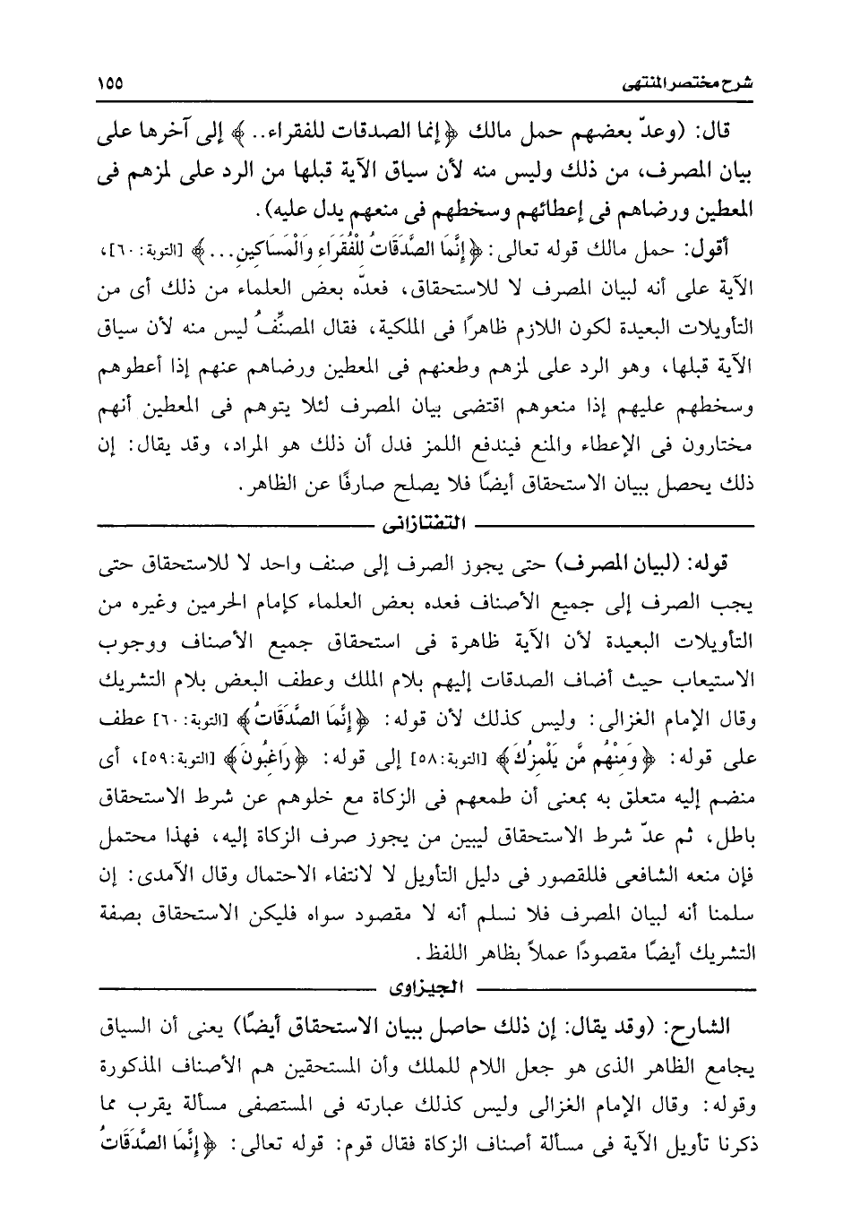 قوله: (لبيان المصرف) حتى يجوز الصرف إلى صنف واحد لا للاستحقاق حتى يجب الصرف إلى جميع الأصناف فعده بعض العلماء كإمام الحرمين وغيره من التأويلات البعيدة لأن الآية ظاهرة فى استحقاق جميع الأصناف ووجوب الاستيعاب حيث أضاف الصدقات إليهم بلام الملك وعطف البعض بلام التشريك وقال الإمام الغزالى: وليس كذلك لأن قوله: {إِنَّمَا الصَّدَقَاتُ} [التوبة: ٦٠] عطف على قوله: {وَمِنْهُمْ مَنْ يَلْمِزُكَ} [التوبة: ٥٨] إلى قوله: {رَاغِبُونَ} [التوبة: ٥٩]، أى منضم إليه متعلق به بمعنى أن طمعهم فى الزكاة مع خلوهم عن شرط الاستحقاق باطل، ثم عدّ شرط الاستحقاق ليبين من يجوز صرف الزكاة إليه، فهذا محتمل فإن منعه الشافعى فللقصور فى دليل التأويل لا لانتفاء الاحتمال وقال الآمدى: إن سلمنا أنه لبيان المصرف فلا نسلم أنه لا مقصود سواه فليكن الاستحقاق بصفة التشريك أيضًا مقصودًا عملًا بظاهر اللفظ.