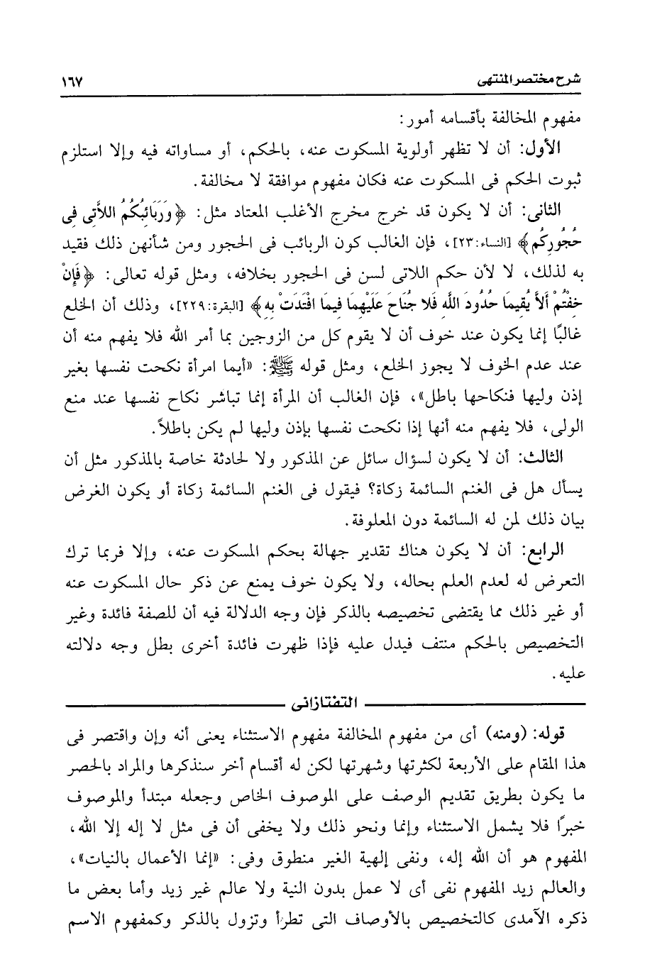 الثانى: أن لا يكون قد خرج مخرج الأغلب المعتاد مثل: {وَرَبَائِبُكُمُ اللَّاتِي فِي حُجُورِكُمْ} [النساء: ٢٣]، فإن الغالب كون الربائب فى الحجور ومن شأنهن ذلك فقيد به لذلك، لا لأن حكم اللاتى لسن فى الحجور بخلافه، ومثل قوله تعالى: {فَإِنْ خِفْتُمْ أَلَّا يُقِيمَا حُدُودَ اللَّهِ فَلَا جُنَاحَ عَلَيْهِمَا فِيمَا افْتَدَتْ بِهِ} [البقرة: ٢٢٩]، وذلك أن الخلع غالبًا إنما يكون عند خوف أن لا يقوم كل من الزوجين بما أمر اللَّه فلا يفهم منه أن عند عدم الخوف لا يجوز الخلع، ومثل قوله -صلى اللَّه عليه وسلم-: "أيما امرأة نكحت نفسها بغير إذن وليها فنكاحها باطل"، فإن الغالب أن المرأة إنما تباشر نكاح نفسها عند منع الولى، فلا يفهم منه أنها إذا نكحت نفسها بإذن وليها لم يكن باطلًا.