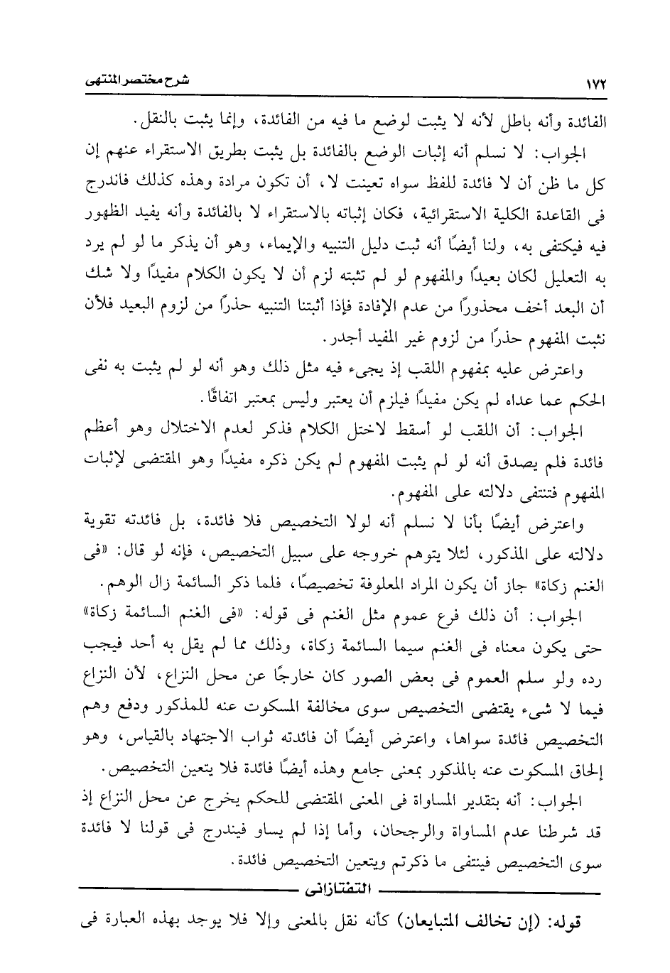 الجواب: لا نسلم أنه إثبات الوضع بالفائدة بل يثبت بطريق الاستقراء عنهم إن كل ما ظن أن لا فائدة للفظ سواه تعينت لا، أن تكون مرادة وهذه كذلك فاندرج فى القاعدة الكلية الاستقرائية، فكان إثباته بالاستقراء لا بالفائدة وأنه يفيد الظهور فيه فيكتفى به، ولنا أيضًا أنه ثبت دليل التنبيه والإيماء، وهو أن يذكر ما لو لم يرد به التعليل لكان بعيدًا والمفهوم لو لم تثبته لزم أن لا يكون الكلام مفيدًا ولا شك أن البعد أخف محذورًا من عدم الإفادة فإذا أثبتنا التنبيه حذرًا من لزوم البعيد فلأن نثبت المفهوم حذرًا من لزوم غير المفيد أجدر.