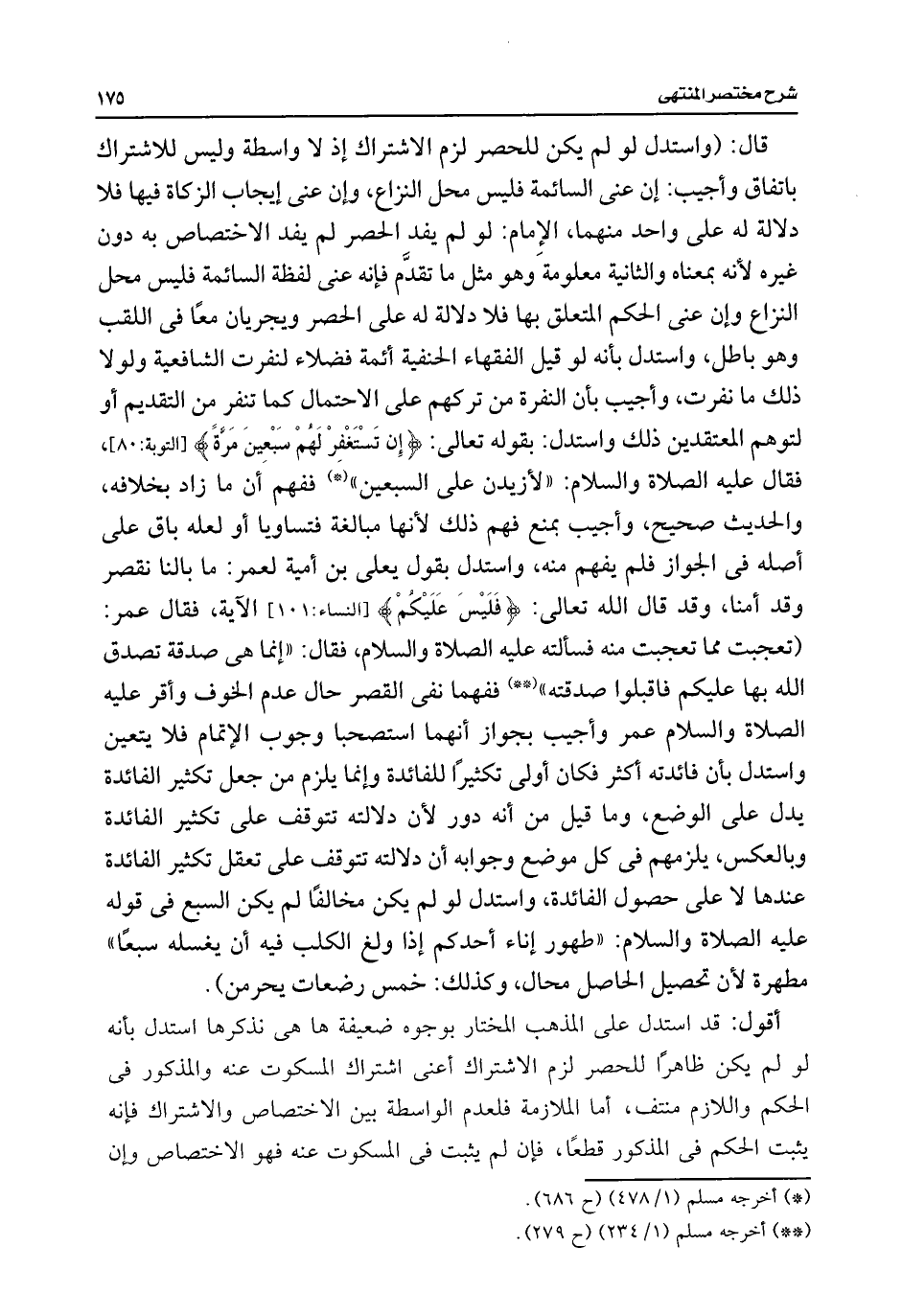 قال: (واستدل لو لم يكن للحصر لزم الاشتراك إذ لا واسطة وليس للاشتراك باتفاق وأجيب: إن عنى السائمة فليس محل النزاع، وإن عنى إيجاب الزكاة فيها فلا دلالة له على واحد منهما، الإمام: لو لم يفد الحصر لم يفد الاختصاص به دون غيره لأنه بمعناه والثانية معلومة وهو مثل ما تقدَّم فإنه عنى لفظة السائمة فليس محل النزاع وإن عنى الحكم المتعلق بها فلا دلالة له على الحصر ويجريان معًا فى اللقب وهو باطل، واستدل بأنه لو قيل الفقهاء الحنفية أئمة فضلاء لنفرت الشافعية ولولا ذلك ما نفرت، وأجيب بأن النفرة من تركهم على الاحتمال كما تنفر من التقديم أو لتوهم المعتقدين ذلك واستدل: بقوله تعالى: {إِنْ تَسْتَغْفِرْ لَهُمْ سَبْعِينَ مَرَّةً} [التوبة: ٨٠]، فقال عليه الصلاة والسلام: "لأزيدن على السبعين" (*) ففهم أن ما زاد بخلافه، والحديث صحيح، وأجيب بمنع فهم ذلك لأنها مبالغة فتساويا أو لعله باق على أصله فى الجواز فلم يفهم منه، واستدل بقول يعلى بن أمية لعمر: ما بالنا نقصر وقد أمنا، وقد قال اللَّه تعالى: {فَلَيْسَ عَلَيْكُمْ} [النساء: ١٠١] الآية، فقال عمر: (تعجبت مما تعجبت منه فسألته عليه الصلاة والسلام، فقال: "إنما هى صدقة تصدق اللَّه بها عليكم فاقبلوا صدقته" (**) ففهما نفى القصر حال عدم الخوف وأقر عليه الصلاة والسلام عمر وأجيب بجواز أنهما استصحبا وجوب الإتمام فلا يتعين واستدل بأن فائدته أكثر فكان أولى تكثيرًا للفائدة وإنما يلزم من جعل تكثير الفائدة يدل على الوضع، وما قيل من أنه دور لأن دلالته تتوقف على تكثير الفائدة وبالعكس، يلزمهم فى كل موضع وجوابه أن دلالته تتوقف على تعقل تكثير الفائدة عندها لا على حصول الفائدة، واستدل لو لم يكن مخالفًا لم يكن السبع فى قوله عليه الصلاة والسلام: "طهور إناء أحدكم إذا ولغ الكلب فيه أن يغسله سبعًا" مطهرة لأن تحصيل الحاصل محال، وكذلك: خمس رضعات يحرمن).