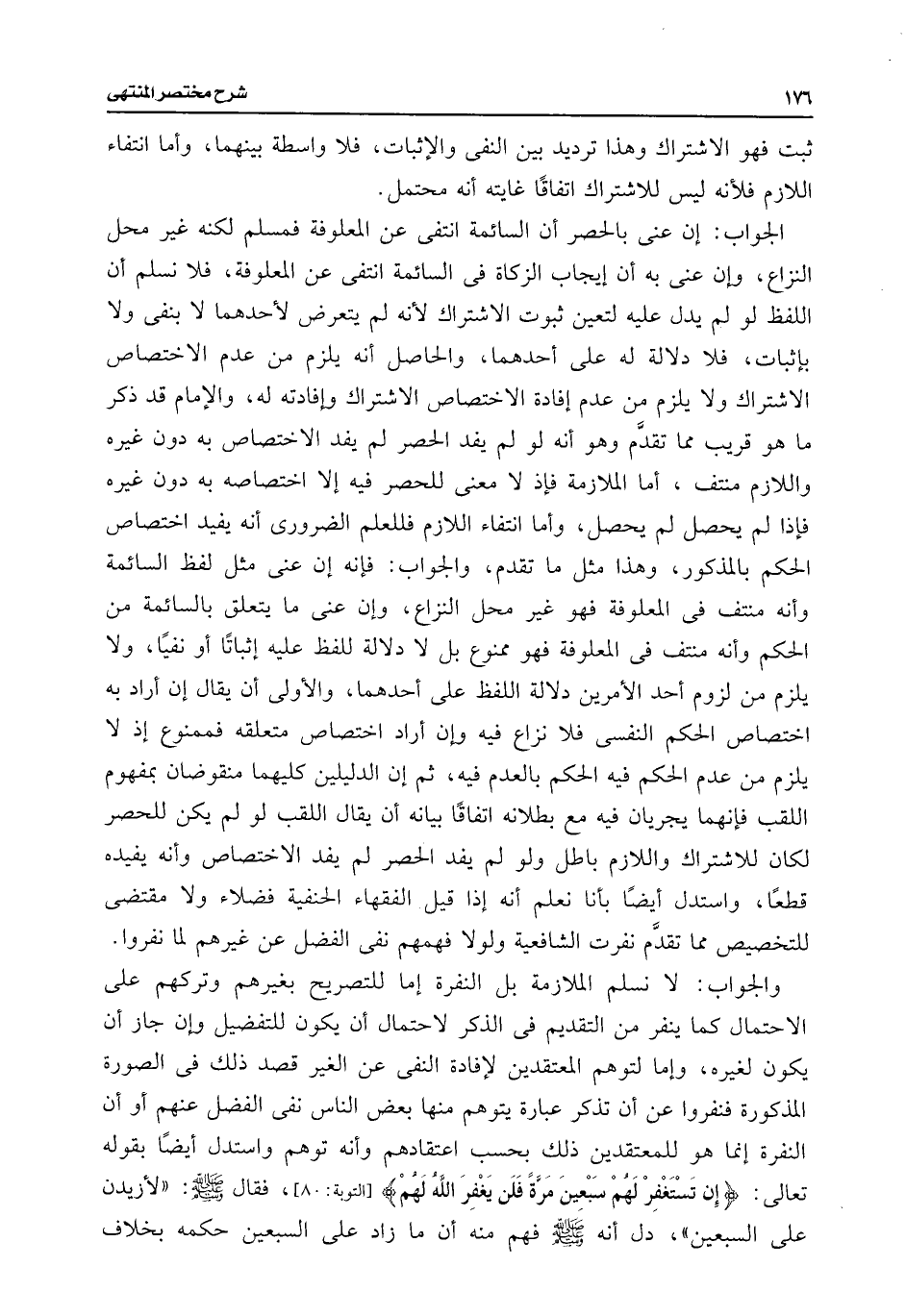الجواب: إن عنى بالحصر أن السائمة انتفى عن المعلوفة فمسلم لكنه غير محل النزاع، وإن عنى به أن إيجاب الزكاة فى السائمة انتفى عن المعلوفة، فلا نسلم أن اللفظ لو لم يدل عليه لتعين ثبوت الاشتراك لأنه لم يتعرض لأحدهما لا بنفى ولا بإثبات، فلا دلالة له على أحدهما، والحاصل أنه يلزم من عدم الاختصاص الاشتراك ولا يلزم من عدم إفادة الاختصاص الاشتراك وإفادته له، والإمام قد ذكر ما هو قريب مما تقدَّم وهو أنه لو لم يفد الحصر لم يفد الاختصاص به دون غيره واللازم منتف، أما الملازمة فإذ لا معنى للحصر فيه إلا اختصاصه به دون غيره فإذا لم يحصل لم يحصل، وأما انتفاء اللازم فللعلم الضرورى أنه يفيد اختصاص الحكم بالمذكور، وهذا مثل ما تقدم، والجواب: فإنه إن عنى مثل لفظ السائمة وأنه منتف فى المعلوفة فهو غير محل النزاع، وإن عنى ما يتعلق بالسائمة من الحكم وأنه منتف فى المعلوفة فهو ممنوع بل لا دلالة للفظ عليه إثباتًا أو نفيًا، ولا يلزم من لزوم أحد الأمرين دلالة اللفظ على أحدهما، والأولى أن يقال إن أراد به اختصاص الحكم النفسى فلا نزاع فيه وإن أراد اختصاص متعلقه فممنوع إذ لا يلزم من عدم الحكم فيه الحكم بالعدم فيه، ثم إن الدليلين كليهما منقوضان بمفهوم اللقب فإنهما يجريان فيه مع بطلانه اتفاقًا بيانه أن يقال اللقب لو لم يكن للحصر لكان للاشتراك واللازم باطل ولو لم يفد الحصر لم يفد الاختصاص وأنه يفيده قطعًا، واستدل أيضًا بأنا نعلم أنه إذا قيل الفقهاء الحنفية فضلاء ولا مقتضى للتخصيص مما تقدَّم نفرت الشافعية ولولا فهمهم نفى الفضل عن غيرهم لما نفروا.