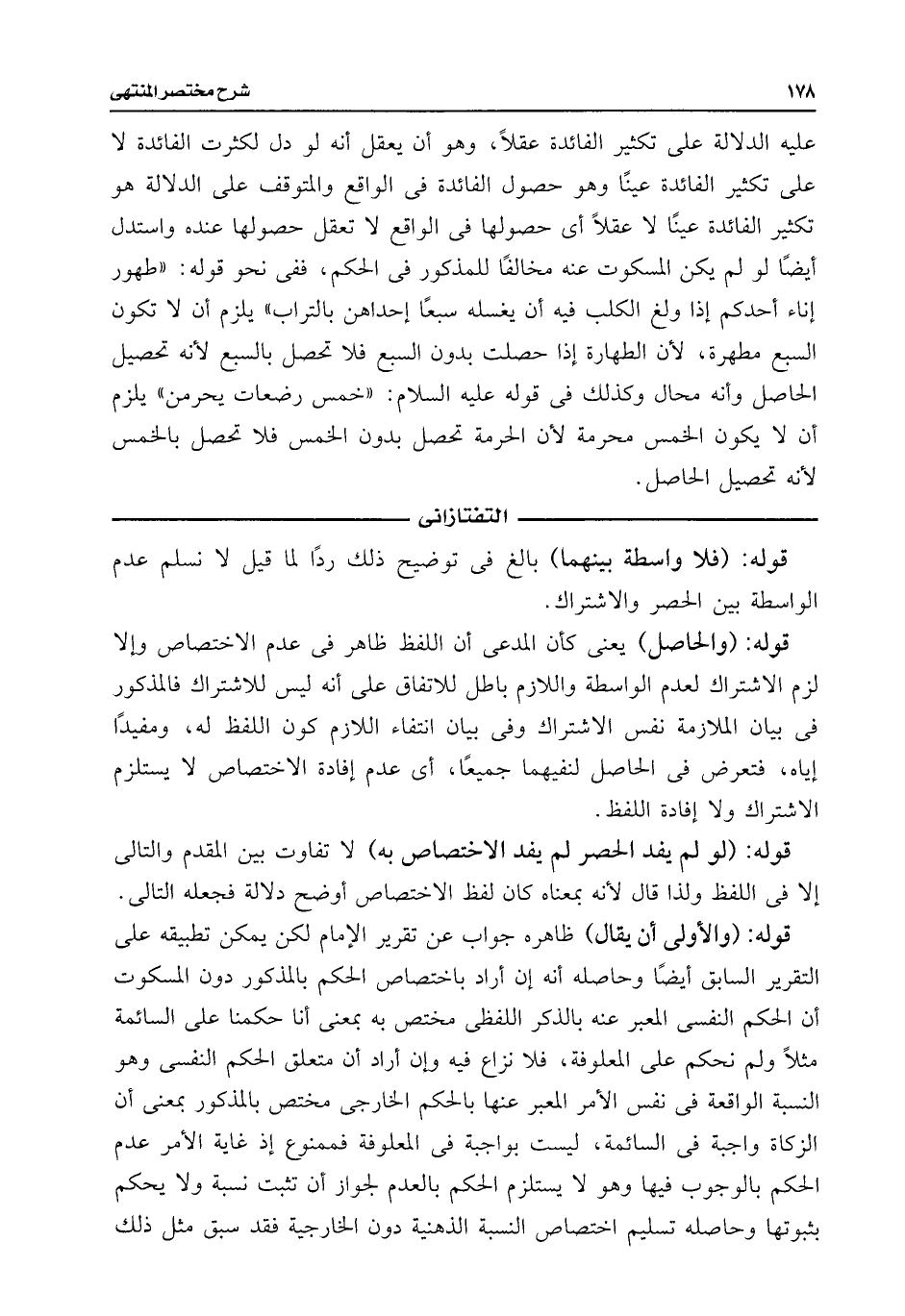 عليه الدلالة على تكثير الفائدة عقلًا، وهو أن يعقل أنه لو دل لكثرت الفائدة لا على تكثير الفائدة عينًا وهو حصول الفائدة فى الواقع والمتوقف على الدلالة هو تكثير الفائدة عينًا لا عقلًا أى حقولها فى الواقع لا تعقل حقولها عنده واستدل أيضًا لو لم يكن المسكوت عنه مخالفًا للمذكور فى الحكم، ففى نحو قوله: "طهور إناء أحدكم إذا ولغ الكلب فيه أن يغسله سبعًا إحداهن بالتراب" يلزم أن لا تكون السبع مطهرة، لأن الطهارة إذا حصلت بدون السبع فلا تحصل بالسبع لأنه تحصيل الحاصل وأنه محال وكذلك فى قوله عليه السلام: "خمس رضعات يحرمن" يلزم أن لا يكون الخمس محرمة لأن الحرمة تحصل بدون الخمس فلا تحصل بالخمس لأنه تحصيل الحاصل.