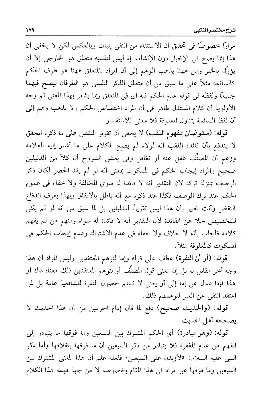 مرارًا خصوصًا فى تحقيق أن الاستثناء من النفى إثبات وبالعكس لكن لا يخفى أن هذا إنما يصح فى الإخبار دون الإنشاء، إذ ليس لنفسيه متعلق هو الخارجى إلا أن يؤوّل بالخبر ومن ههنا يذهب الوهم إلى أن المراد بالمتعلق ههنا هو طرف الحكم كالسائمة مثلًا على ما سبق من أن متعلق الذكر النفسى هو الطرفان ليصع فيهما جميعًا ولفظه فى قوله عدم الحكم فيه أى فى المتعلق ربما يشعر بهذا المعنى ثم وجه الأولوية أن كلام المستدل ظاهر فى أن المراد اختصاص الحكم ولا يذهب وهم إلى أن لفظ السائمة يتناول المعلوفة فلا معنى للاستفسار.