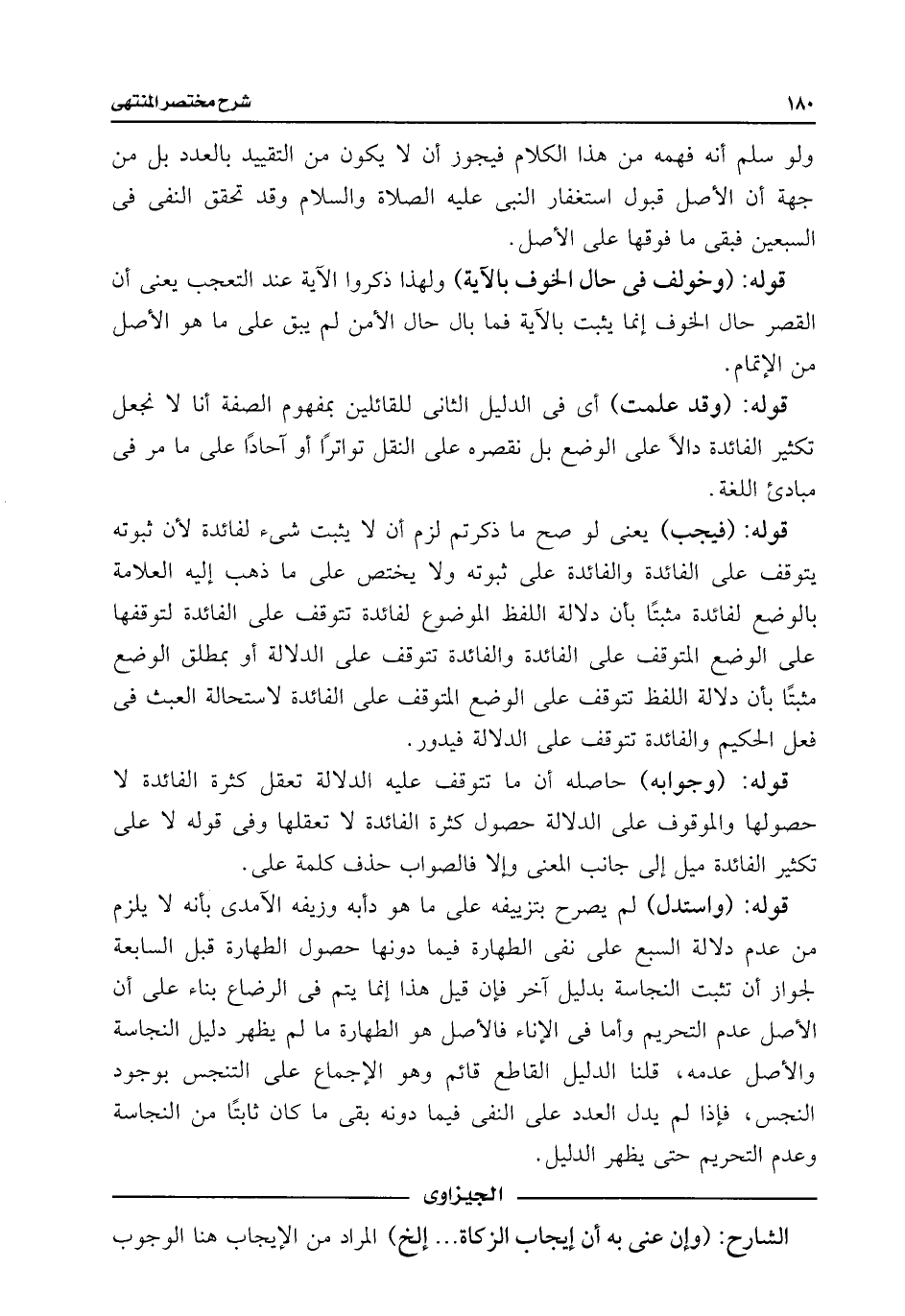 قوله: (واستدل) لم يصرح بتزييفه على ما هو دأبه وزيفه الآمدى بأنه لا يلزم من عدم دلالة السبع على نفى الطهارة فيما دونها حصول الطهارة قبل السابعة لجواز أن تثبت النجاسة بدليل آخر فإن قيل هذا إنما يتم فى الرضاع بناء على أن الأصل عدم التحريم وأما فى الإناء فالأصل هو الطهارة ما لم يظهر دليل النجاسة والأصل عدمه، قلنا الدليل القاطع قائم وهو الإجماع على التنجس بوجود النجس، فإذا لم يدل العدد على النفى فيما دونه بقى ما كان ثابتًا من النجاسة وعدم التحريم حتى يظهر الدليل.