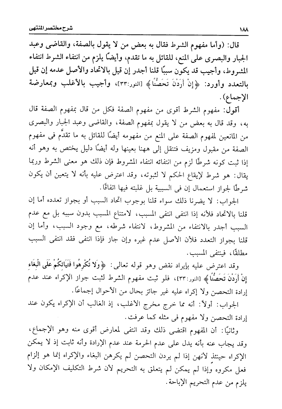 قال: (وأما مفهوم الشرط فقال به بعض من لا يقول بالصفة، والقاضى وعبد الجبار والبصرى على المنع، للقائل به ما تقدم، وأيضًا يلزم من انتفاء الشرط انتفاء المشروط، وأجيب قد يكون سببًا قلنا أجدر إن قيل بالاتحاد والأصل عدمه إن قيل بالتعدد وأورد: {إِنْ أَرَدْنَ تَحَصُّنًا} [النور: ٣٣]، وأجيب بالأغلب وبمعارضة الإجماع).