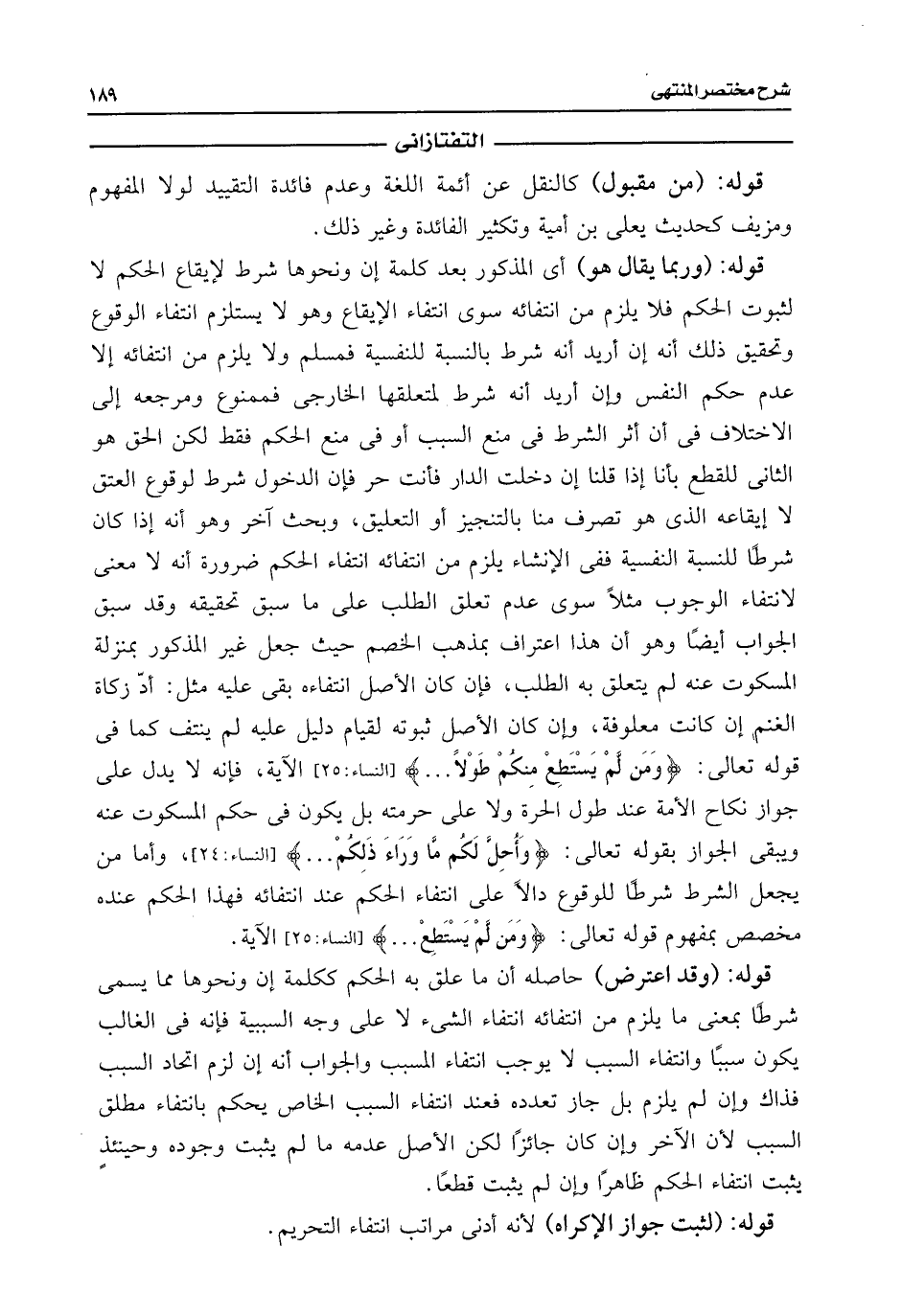 قوله: (وربما يقال هو) أى المذكور بعد كلمة إن ونحوها شرط لإيقاع الحكم لا لثبوت الحكم فلا يلزم من انتفائه سوى انتفاء الإيقاع وهو لا يستلزم انتفاء الوقوع وتحقيق ذلك أنه إن أريد أنه شرط بالنسبة للنفسية فمسلم ولا يلزم من انتفائه إلا عدم حكم النفس وإن أريد أنه شرط لمتعلقها الخارجى فممنوع ومرجعه إلى الاختلاف فى أن أثر الشرط فى منع السبب أو فى منع الحكم فقط لكن الحق هو الثانى للقطع بأنا إذا قلنا إن دخلت الدار فأنت حر فإن الدخول شرط لوقوع العتق لا إيقاعه الذى هو تصرف منا بالتنجيز أو التعليق، وبحث آخر وهو أنه إذا كان شرطًا للنسبة النفسية ففى الإنشاء يلزم من انتفائه انتفاء الحكم ضرورة أنه لا معنى لانتفاء الوجوب مثلًا سوى عدم تعلق الطلب على ما سبق تحقيقه وقد سبق الجواب أيضًا وهو أن هذا اعتراف بمذهب الخصم حيث جعل غير المذكور بمنزلة المسكوت عنه لم يتعلق به الطلب، فإن كان الأصل انتفاءه بقى عليه مثل: أدّ زكاة الغنم إن كانت معلوفة، وإن كان الأصل ثبوته لقيام دليل عليه لم ينتف كما فى قوله تعالى: {وَمَنْ لَمْ يَسْتَطِعْ مِنْكُمْ طَوْلًا. . .} [النساء: ٢٥] الآية، فإنه لا يدل على جواز نكاح الأمة عند طول الحرة ولا على حرمته بل يكون فى حكم المسكوت عنه ويبقى الجواز بقوله تعالى: {وَأُحِلَّ لَكُمْ مَا وَرَاءَ ذَلِكُمْ. . .} [النساء: ٢٤]، وأما من يجعل الشرط شرطًا للوقوع دالًا على انتفاء الحكم عند انتفائه فهذا الحكم عنده مخصص بمفهوم قوله تعالى: {وَمَنْ لَمْ يَسْتَطِعْ. . .} [النساء: ٢٥] الآية.