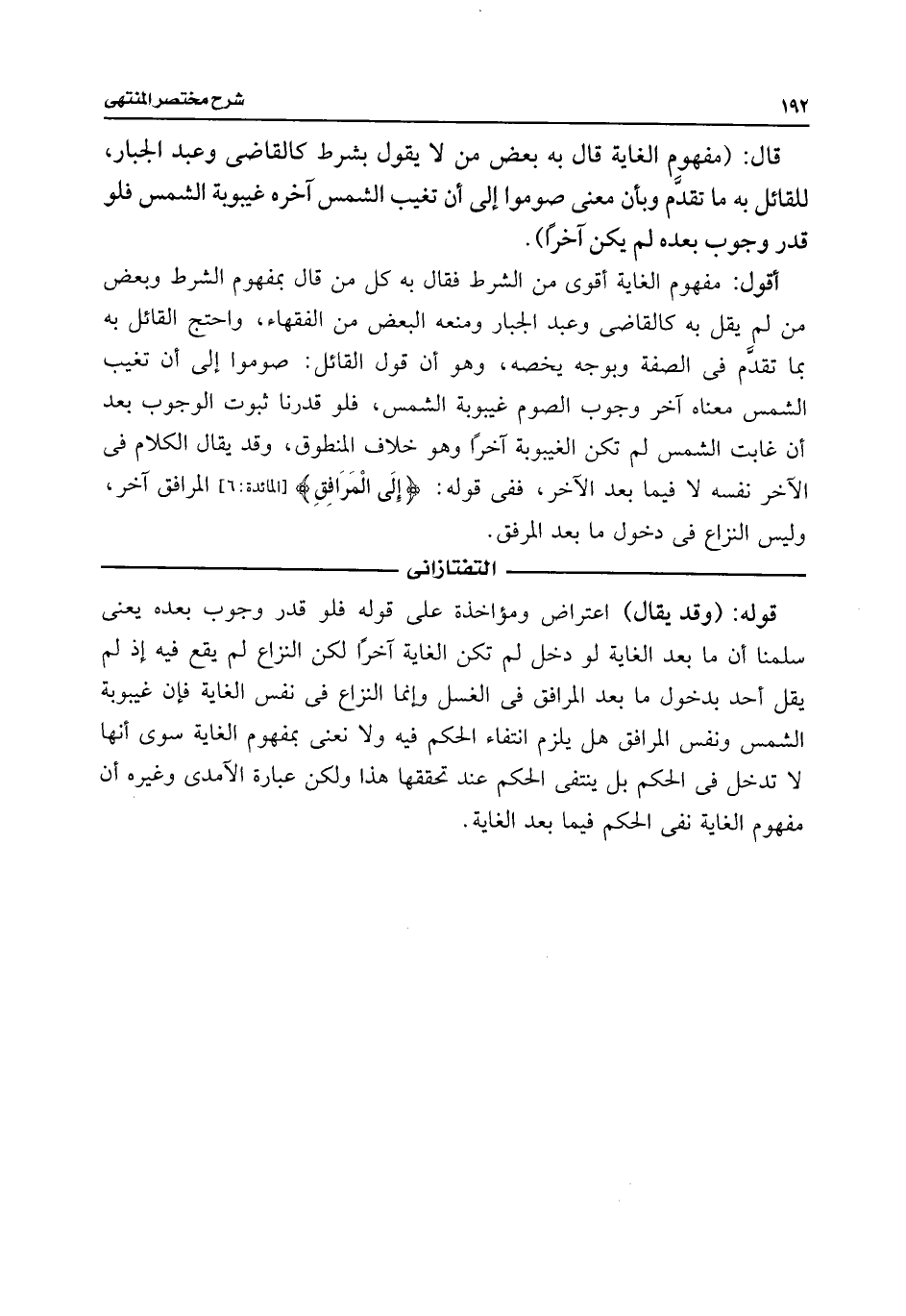 قوله: (وقد يقال) اعتراض ومؤاخذة على قوله فلو قدر وجوب بعده يعنى سلمنا أن ما بعد الغاية لو دخل لم تكن الغاية آخرًا لكن النزاع لم يقع فيه إذ لم يقل أحد بدخول ما بعد المرافق فى الغسل وإنما النزاع فى نفس الغاية فإن غيبوبة الشمس ونفس المرافق هل يلزم انتفاء الحكم فيه ولا نعنى بمفهوم الغاية سوى أنها لا تدخل فى الحكم بل ينتفى الحكم عند تحققها هذا ولكن عبارة الآمدى وغيره أن مفهوم الغاية نفى الحكم فيما بعد الغاية.