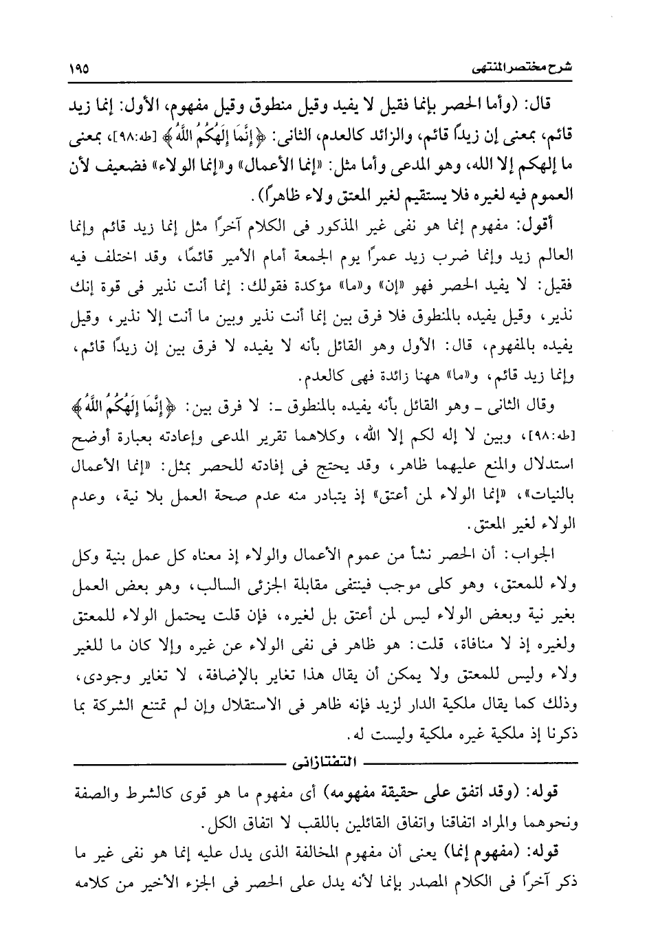 قال: (وأما الحصر بإنما فقيل لا يفيد وقيل منطوق وقيل مفهوم، الأول: إنما زيد قائم، بمعنى إن زيدًا قائم، والزائد كالعدم، الثانى: {إِنَّمَا إِلَهُكُمُ اللَّهُ} [طه: ٩٨]، بمعنى ما إلهكم إلا اللَّه، وهو المدعى وأما مثل: "إنما الأعمال" و"إنما الولاء" فضعيف لأن العموم فيه لغيره فلا يستقيم لغير المعتق ولاء ظاهرًا).