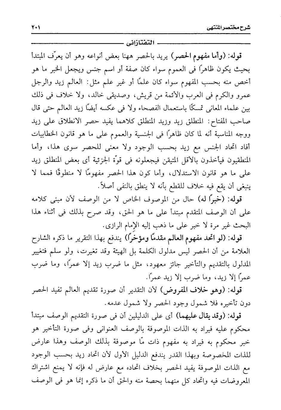 قوله: (وأما مفهوم الحصر) يريد بالحصر ههنا بعض أنواعه وهو أن يعرّف المبتدأ بحيث يكون ظاهرًا فى العموم سواء كان صفة أو اسم جنس ويجعل الخبر ما هو أخص منه بحسب المفهوم سواء كان علمًا أو غير علم مثل: العالم زيد والرجل عمرو والكرم فى العرب والأئمة من قريش، وصديقى خالد، ولا خلاف فى ذلك بين علماء المعانى تمسكًا باستعمال الفصحاء ولا فى عكسه أيضًا زيد العالم حتى قال صاحب المفتاح: المنطلق زيد وزيد المنطلق كلاهما يفيد حصر الانطلاق على زيد ووجه المناسبة أنه لما كان ظاهرًا فى الجنسية والعموم على ما هو قانون الخطابيات أفاد اتحاد الجنس مع زيد بحسب الوجود ولا معنى للحصر سوى هذا، وأما المنطقيون فيأخذون بالأقل المتيقن فيجعلونه فى قوّة الجزئية أى بعض المنطلق زيد على ما هو قانون الاستدلال، وأما كون هذا الحصر مفهومًا لا منطوقًا فمما لا ينبغى أن يقع فيه خلاف للقطع بأنه لا ينطق بالنفى أصلًا.