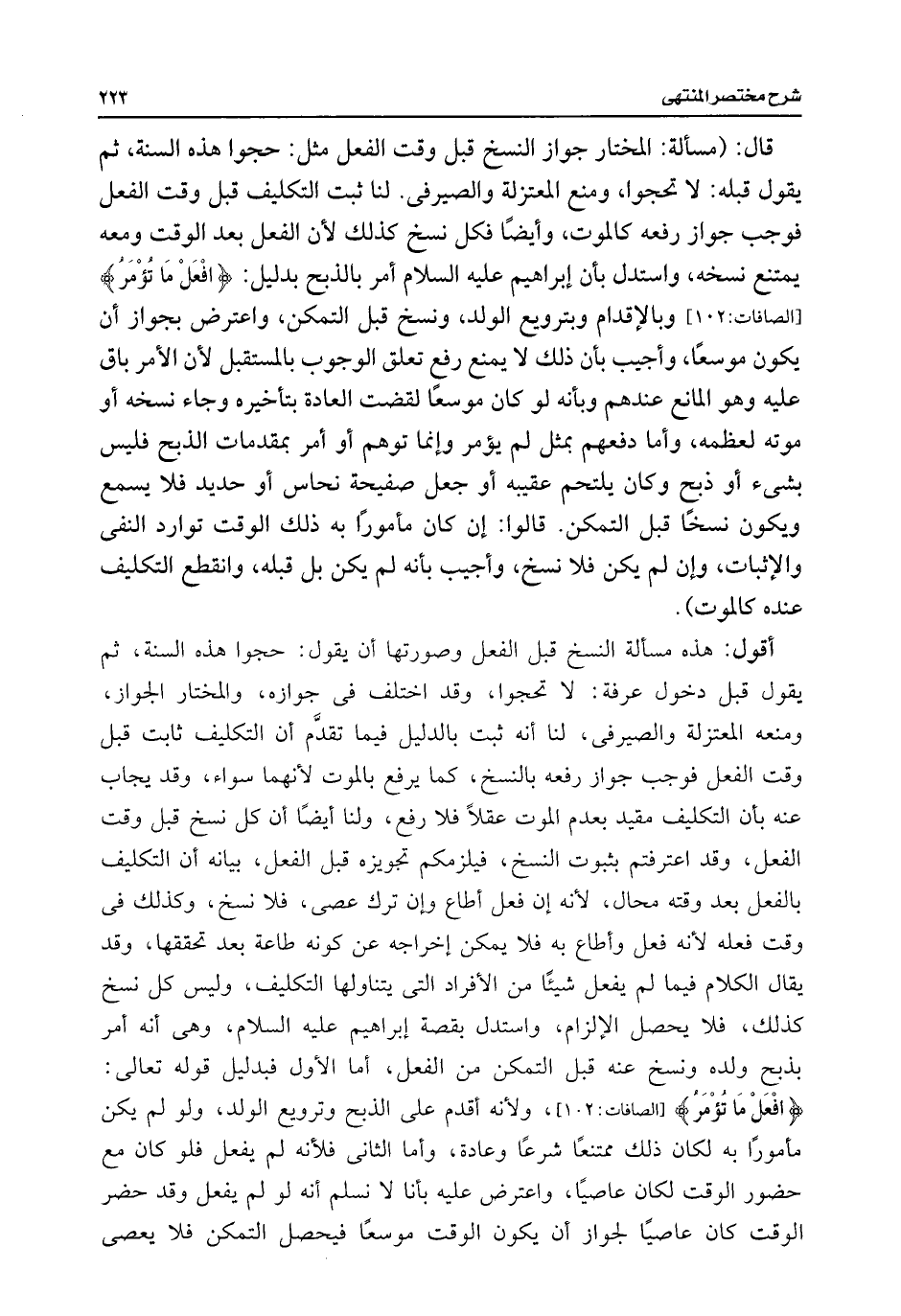 أقول: هذه مسألة النسخ قبل الفعل وصورتها أن يقول: حجوا هذه السنة، ثم يقول قبل دخول عرفة: لا تحجوا، وقد اختلف فى جوازه، والمختار الجواز، ومنعه المعتزلة والصيرفى، لنا أنه ثبت بالدليل فيما تقدَّم أن التكليف ثابت قبل وقت الفعل فوجب جواز رفعه بالنسخ، كما يرفع بالموت لأنهما سواء، وقد يجاب عنه بأن التكليف مقيد بعدم الموت عقلًا فلا رفع، ولنا أيضًا أن كل نسخ قبل وقت الفعل، وقد اعترفتم بثبوت النسخ، فيلزمكم تجويزه قبل الفعل، بيانه أن التكليف بالفعل بعد وقته محال، لأنه إن فعل أطاع وإن ترك عصى، فلا نسخ، وكذلك فى وقت فعله لأنه فعل وأطاع به فلا يمكن إخراجه عن كونه طاعة بعد تحققها، وقد يقال الكلام فيما لم يفعل شيئًا من الأفراد التى يتناولها التكليف، وليس كل نسخ كذلك، فلا يحصل الإلزام، واستدل بقصة إبراهيم عليه السلام، وهى أنه أمر بذبح ولده ونسخ عنه قبل التمكن من الفعل، أما الأول فبدليل قوله تعالى: {افْعَلْ مَا تُؤْمَرُ} [الصافات: ١٠٢]، ولأنه أقدم على الذبح وترويع الولد، ولو لم يكن مأمورًا به لكان ذلك ممتنعًا شرعًا وعادة، وأما الثانى فلأنه لم يفعل فلو كان مع حضور الوقت لكان عاصيًا، واعترض عليه بأنا لا نسلم أنه لو لم يفعل وقد حضر الوقت كان عاصيًا لجواز أن يكون الوقت موسعًا فيحصل التمكن فلا يعصى