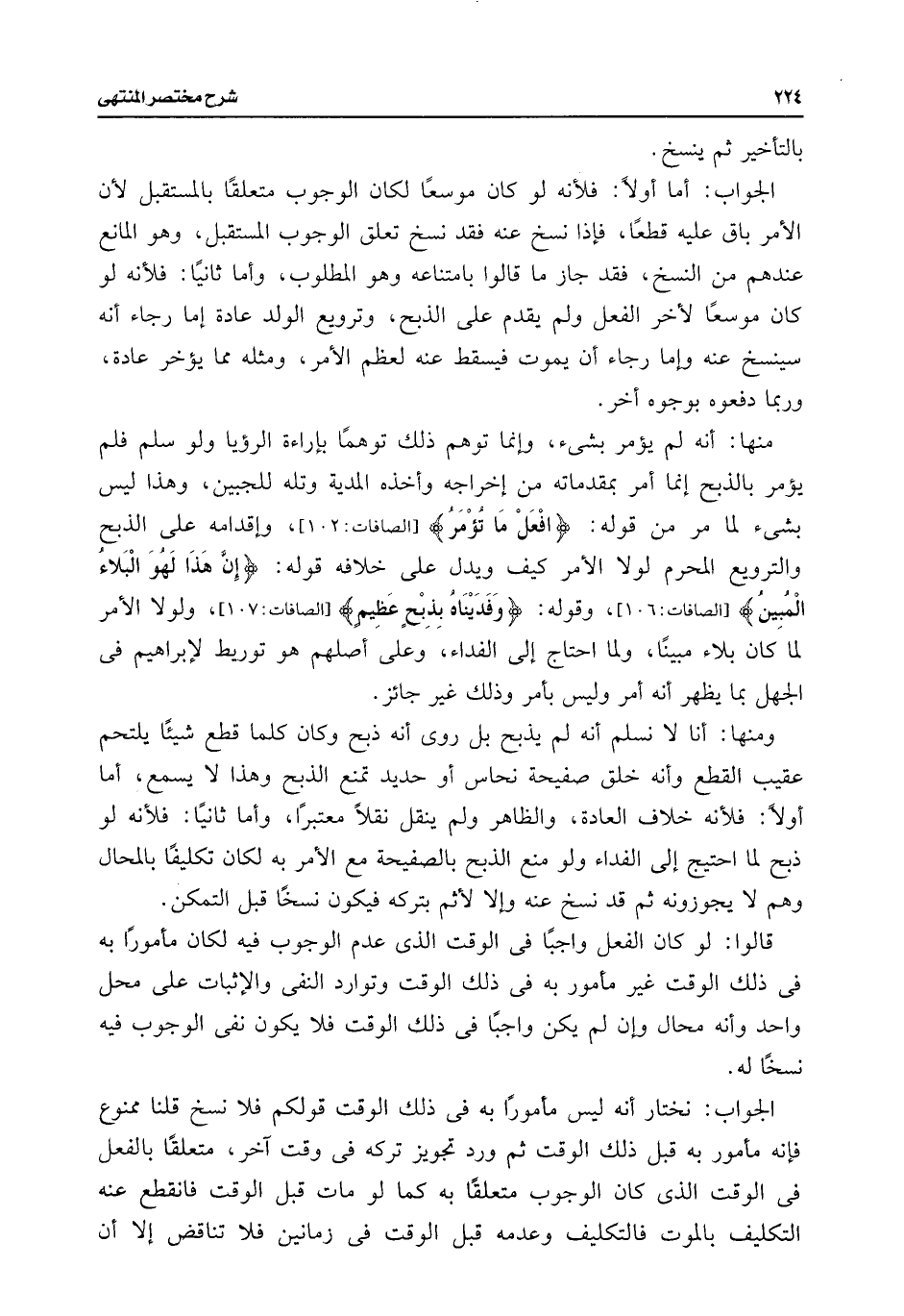 الجواب: أما أولًا: فلأنه لو كان موسعًا لكان الوجوب متعلقًا بالمستقبل لأن الأمر باق عليه قطعًا، فإذا نسخ عنه فقد نسخ تعلق الوجوب المستقبل، وهو المانع عندهم من النسخ، فقد جاز ما قالوا بامتناعه وهو المطلوب، وأما ثانيًا: فلأنه لو كان موسعًا لأخر الفعل ولم يقدم على الذبح، وترويع الولد عادة إما رجاء أنه سينسخ عنه وإما رجاء أن يموت فيسقط عنه لعظم الأمر، ومثله مما يؤخر عادة، وربما دفعوه بوجوه أخر.