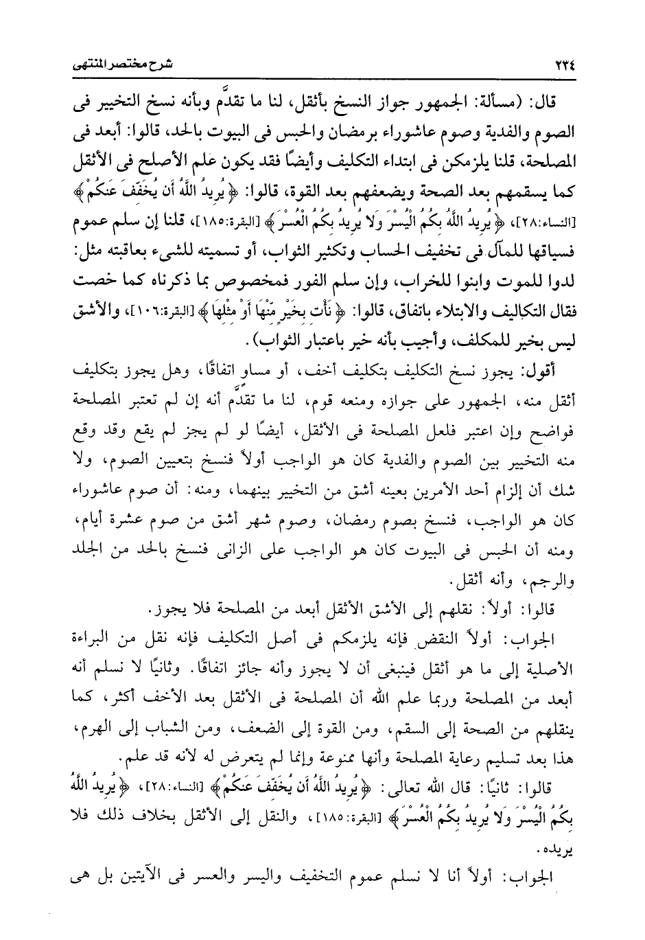 قال: (مسألة: الجمهور جواز النسخ بأثقل، لنا ما تقدَّم وبأنه نسخ التخيير فى الصوم والفدية وصوم عاشوراء برمضان والحبس فى البيوت بالحد، قالوا: أبعد فى المصلحة، قلنا يلزمكن فى ابتداء التكليف وأيضًا فقد يكون علم الأصلح فى الأثقل كما يسقمهم بعد الصحة ويضعفهم بعد القوة، قالوا: {يُرِيدُ اللَّهُ أَنْ يُخَفِّفَ عَنْكُمْ} [النساء: ٢٨]، {يُرِيدُ اللَّهُ بِكُمُ الْيُسْرَ وَلَا يُرِيدُ بِكُمُ الْعُسْرَ} [البقرة: ١٨٥]، قلنا إن سلم عموم فسياقها للمآل فى تخفيف الحساب وتكثير الثواب، أو تسميته للشئ بعاقبته مثل: لدوا للموت وابنوا للخراب، وإن سلم الفور فمخصوص بما ذكرناه كما خصت فقال التكاليف والابتلاء باتفاق، قالوا: {نَأْتِ بِخَيْرٍ مِنْهَا أَوْ مِثْلِهَا} [البقرة: ١٠٦]، والأشق ليس بخير للمكلف، وأجيب بأنه خير باعتبار الثواب).