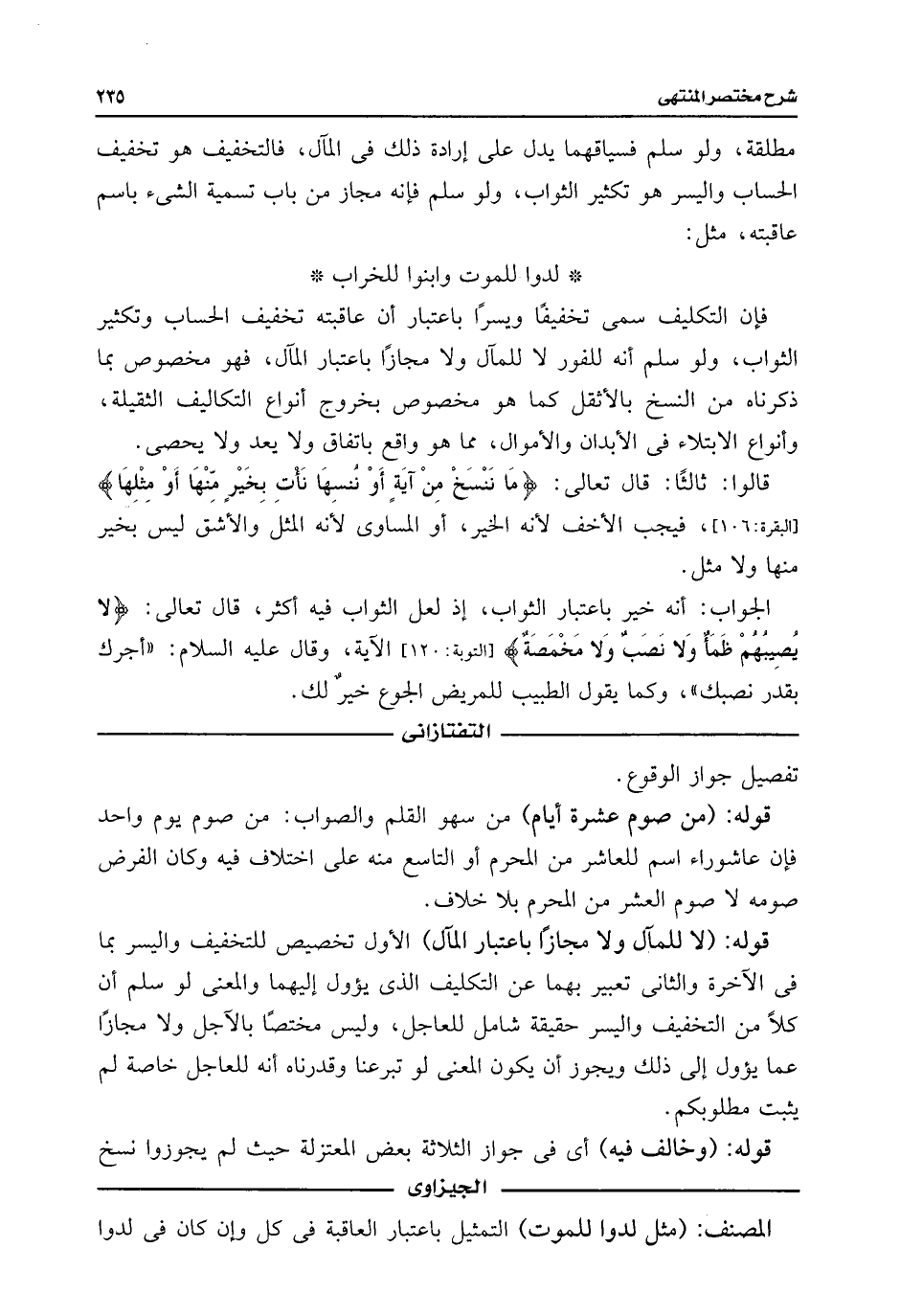 فإن التكليف سمى تخفيفًا ويسرًا باعتبار أن عاقبته تخفيف الحساب وتكثير الثواب، ولو سلم أنه للفور لا للمآل ولا مجازًا باعتبار المآل، فهو مخصوص بما ذكرناه من النسخ بالأثقل كما هو مخصوص بخروج أنواع التكاليف الثقيلة، وأنواع الابتلاء فى الأبدان والأموال، مما هو واقع باتفاق ولا يعد ولا يحصى.