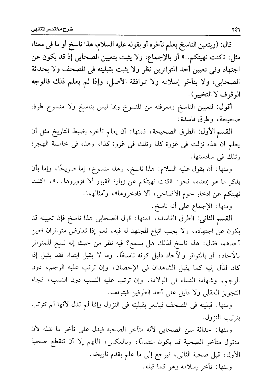 القسم الثانى: الطرق الفاسدة، فمنها: قول الصحابى هذا ناسخ فإن تعيينه قد يكون عن اجتهاده، ولا يجب اتباع المجتهد له فيه، نعم إذا تعارض متواتران فعين أحدهما فقال: هذا ناسخ لذلك هل يسمع؟ فيه نظر من حيث إنه نسخ للمتواتر بالآحاد، أو بالمتواتر والآحاد دليل كونه ناسخًا، وما لا يقبل ابتداء فقد يقبل إذا كان المآل إليه كما يقبل الشاهدان فى الإحصان، وإن ترتب عليه الرجم، دون الرجم، وشهادة النساء فى الولادة، وإن ترتب عليه النسب دون النسب، فجاء التجويز العقلى ولا دليل على أحد الطرفين فيتوقف.