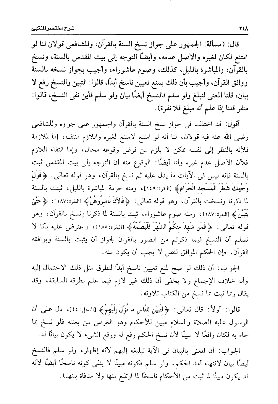 قال: (مسألة: الجمهور على جواز نسخ السنة بالقرآن، وللشافعى قولان لنا لو امتنع لكان لغيره والأصل عدمه، وأيضًا التوجه إلى بيت المقدس بالسنة، ونسخ بالقرآن، والمباشرة بالليل، كذلك، وصوم عاشوراء، وأجيب بجواز نسخه بالسنة ووافق القرآن، وأجيب بأن ذلك يمنع تعيين ناسخ أبدًا، قالوا: التبين والنسخ رفع لا بيان، قلنا المعنى لتبلغ ولو سلم فالنسخ أيضًا بيان ولو سلم فأين نفى النسخ، قالوا: منفر قلنا إذا علم أنه مبلغ فلا نفرة).