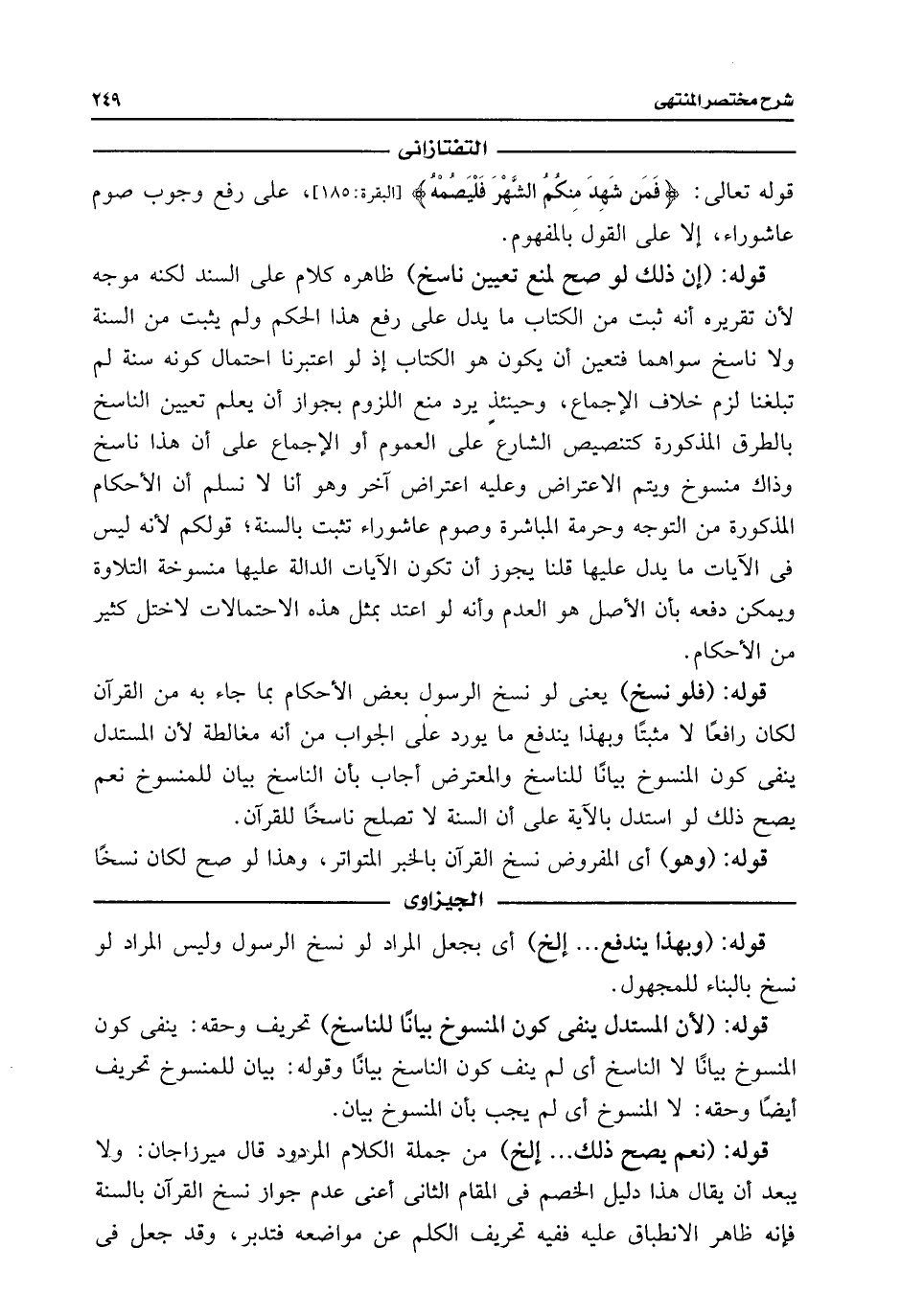 قوله: (إن ذلك لو صح لمنع تعيين ناسخ) ظاهره كلام على السند لكنه موجه لأن تقريره أنه ثبت من الكتاب ما يدل على رفع هذا الحكم ولم يثبت من السنة ولا ناسخ سواهما فتعين أن يكون هو الكتاب إذ لو اعتبرنا احتمال كونه سنة لم تبلغنا لزم خلاف الإجماع، وحينئذٍ يرد منع اللزوم بجواز أن يعلم تعيين الناسخ بالطرق المذكورة كتنصيص الشارع على العموم أو الإجماع على أن هذا ناسخ وذاك منسوخ ويتم الاعتراض وعليه اعتراض آخر وهو أنا لا نسلم أن الأحكام المذكورة من التوجه وحرمة المباشرة وصوم عاشوراء تثبت بالسنة؛ قولكم لأنه ليس فى الآيات ما يدل عليها قلنا يجوز أن تكون الآيات الدالة عليها منسوخة التلاوة ويمكن دفعه بأن الأصل هو العدم وأنه لو اعتد بمثل هذه الاحتمالات لاختل كثير من الأحكام.
