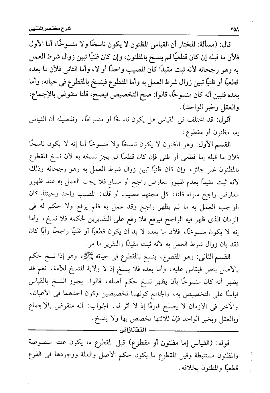 قوله: (القياس إما مظنون أو مقطوع) قيل المقطوع ما يكون علته منصوصة والمظنون مستنبطة وقيل المقطوع ما يكون حكم الأصل والعلة ووجودها فى الفرع قطعيًا والمظنون بخلافه.