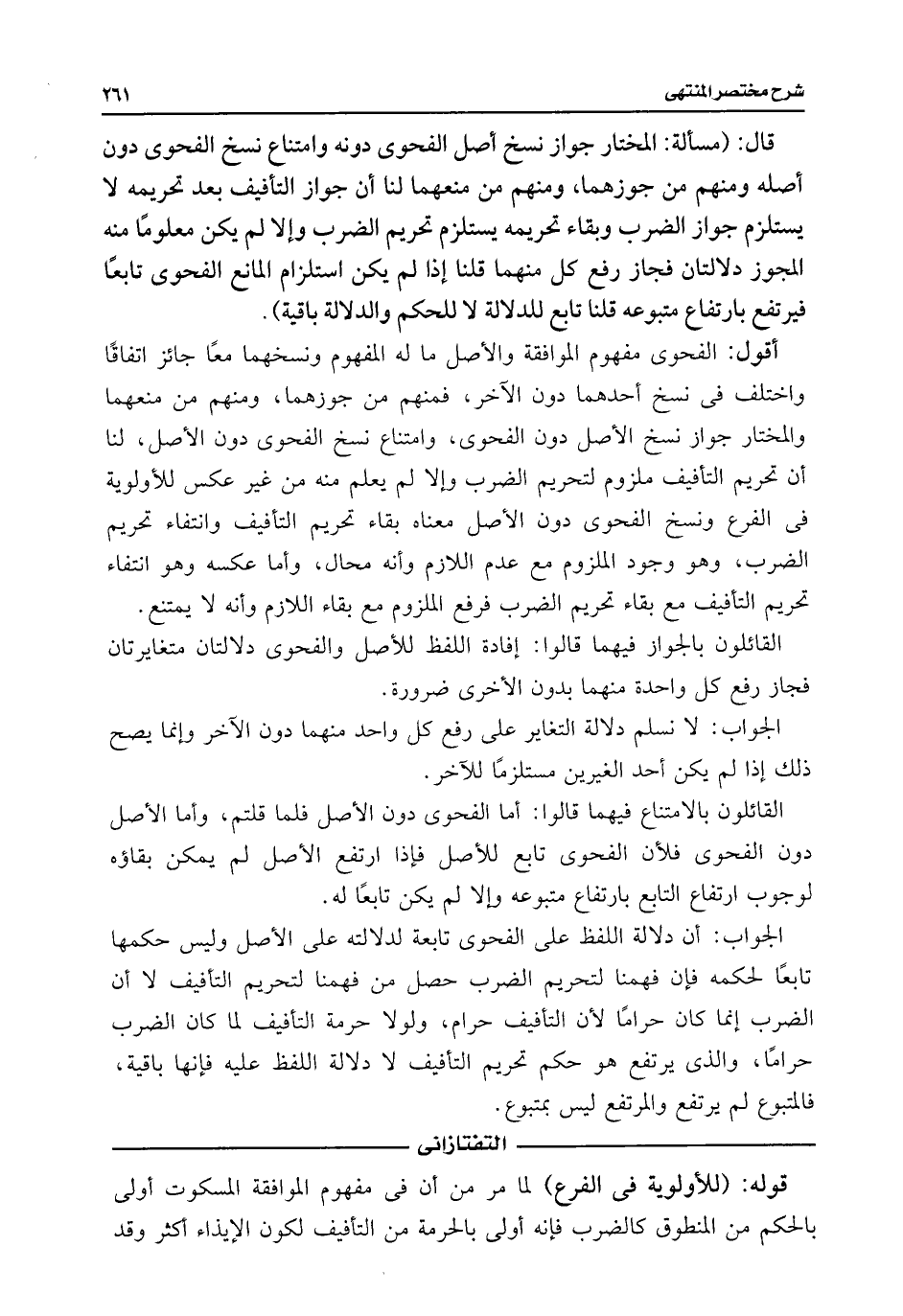 أقول: الفحوى مفهوم الموافقة والأصل ما له المفهوم ونسخهما معًا جائز اتفاقًا واختلف فى نسخ أحدهما دون الآخر، فمنهم من جوزهما، ومنهم من منعهما والمختار جواز نسخ الأصل دون الفحوى، وامتناع نسخ الفحوى دون الأصل، لنا أن تحريم التأفيف ملزوم لتحريم الضرب وإلا لم يعلم منه من غير عكس للأولوية فى الفرع ونسخ الفحوى دون الأصل معناه بقاء تحريم التأفيف وانتفاء تحريم الضرب، وهو وجود الملزوم مع عدم اللازم وأنه محال، وأما عكسه وهو انتفاء تحريم التأفيف مع بقاء تحريم الضرب فرفع الملزوم مع بقاء اللازم وأنه لا يمتنع.