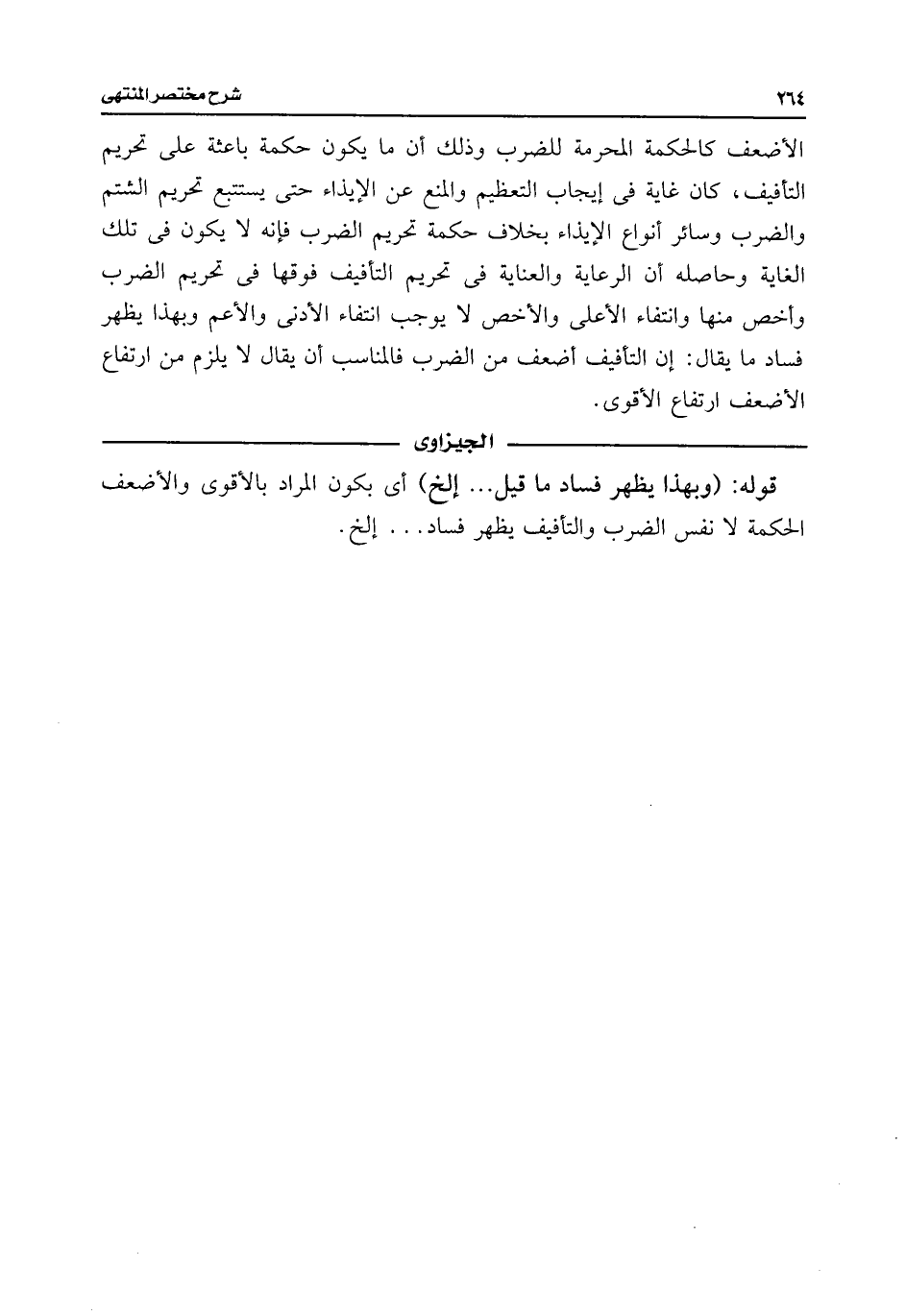 الأضعف كالحكمة المحرمة للضرب وذلك أن ما يكون حكمة باعثة على تحريم التأفيف، كان غاية فى إيجاب التعظيم والمنع عن الإيذاء حتى يستتبع تحريم الشتم والضرب وسائر أنواع الإيذاء بخلاف حكمة تحريم الضرب فإنه لا يكون فى تلك الغاية وحاصله أن الرعاية والعناية فى تحريم التأفيف فوقها فى تحريم الضرب وأخص منها وانتفاء الأعلى والأخص لا يوجب انتفاء الأدنى والأعم وبهذا يظهر فساد ما يقال: إن التأفيف أضعف من الضرب فالمناسب أن يقال لا يلزم من ارتفاع الأضعف ارتفاع الأقوى.
