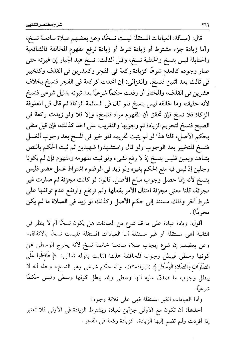 قال: (مسألة: العبادات المستقلة ليست نسخًا، وعن بعضهم صلاة سادسة نسخ، وأما زيادة جزء مشترط أو زيادة شرط أو زيادة نرفع مفهوم المخالفة فالشافعية والحنابلة ليس بنسخ والحنفية نسخ، وقيل الثالث: نسخ عبد الجبار إن غيرته حتى صار وجوده كالعدم شرعًا كزيادة ركعة فى الفجر وكعشرين فى القذف وكتخيير فى ثالث بعد اثنين فنسخ. والغزالى: إن اتحدت كركعة فى الفجر فنسخ بخلاف عشرين فى القذف، والمختار أن رفعت حكمًا شرعيًا بعد ثبوته بدليل شرعى فنسخ لأنه حقيقته وما خالفه ليس بنسخ فلو قال فى السائمة الزكاة ثم قال فى المعلوفة الزكاة فلا نسخ فإن تحقق أن المفهوم مراد فنسخ، وإلا فلا ولو زيدت ركعة فى الصبح فنسخ لتحريم الزيادة ثم وجوبها والتغريب على الحد كذلك، فإن قيل منفى بحكم الأصل، قلنا هذا لو لم يثبت تحريمه فلو خير فى المسح بعد وجوب الغسل فنسخ للتخيير بعد الوجوب ولو قال واستشهدوا شهيدين ثم ثبت الحكم بالنص بشاهد ويمين فليس بنسخ إذ لا رفع لشئ ولو ثبت مفهومه ومفهوم فإن لم يكونا رجلين إذ ليس فيه منع الحكم بغيره ولو زيد فى الوضوء اشتراط غسل عضو فليس بنسخ لأنه إنما حصل وجوب مباح الأصل. قالوا: لو كانت مجزئة ثم صارت غير مجزئة، قلنا معنى مجزئة امتثال الأمر بفعلها ولم ترتفع وارتفع عدم توقفها على شرط آخر وذلك مستند إلى حكم الأصل وكذلك لو زيد فى الصلاة ما لم يكن محرمًا).