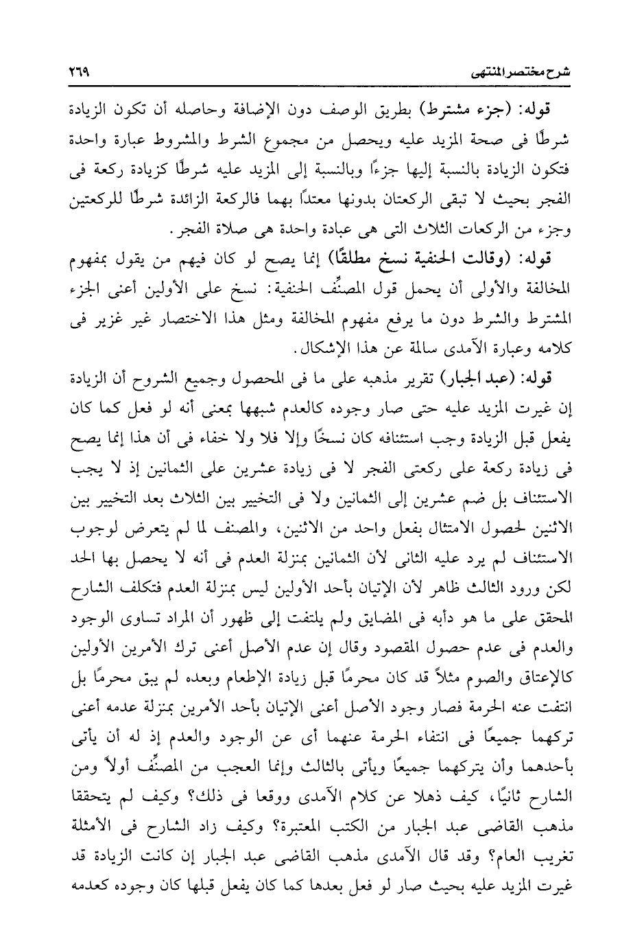 قوله: (عبد الجبار) تقرير مذهبه على ما فى المحصول وجميع الشروح أن الزيادة إن غيرت المزيد عليه حتى صار وجوده كالعدم شبهها بمعنى أنه لو فعل كما كان يفعل قبل الزيادة وجب استئنافه كان نسخًا وإلا فلا ولا خفاء فى أن هذا إنما يصح فى زيادة ركعة على ركعتى الفجر لا فى زيادة عشرين على الثمانين إذ لا يجب الاستئناف بل ضم عشرين إلى الثمانين ولا فى التخيير بين الثلاث بعد التخيير بين الاثنين لحصول الامتثال بفعل واحد من الاثنين، والمصنف لما لم يتعرض لوجوب الاستئناف لم يرد عليه الثانى لأن الثمانين بمنزلة العدم فى أنه لا يحصل بها الحد لكن ورود الثالث ظاهر لأن الإتيان بأحد الأولين ليس بمنزلة العدم فتكلف الشارح المحقق على ما هو دأبه فى المضايق ولم يلتفت إلى ظهور أن المراد تساوى الوجود والعدم فى عدم حصول المقصود وقال إن عدم الأصل أعنى ترك الأمرين الأولين كالإعتاق والصوم مثلًا قد كان محرمًا قبل زيادة الإطعام وبعده لم يبق محرمًا بل انتفت عنه الحرمة فصار وجود الأصل أعنى الإتيان بأحد الأمرين بمنزلة عدمه أعنى تركهما جميعًا فى انتفاء الحرمة عنهما أى عن الوجود والعدم إذ له أن يأتى بأحدهما وأن يتركهما جميعًا ويأتى بالثالث وإنما العجب من المصنِّف أولًا ومن الشارح ثانيًا، كيف ذهلا عن كلام الآمدى ووقعا فى ذلك؟ وكيف لم يتحققا مذهب القاضى عبد الجبار من الكتب المعتبرة؟ وكيف زاد الشارح فى الأمثلة تغريب العام؟ وقد قال الآمدى مذهب القاضى عبد الجبار إن كانت الزيادة قد غيرت المزيد عليه بحيث صار لو فعل بعدها كما كان يفعل قبلها كان وجوده كعدمه