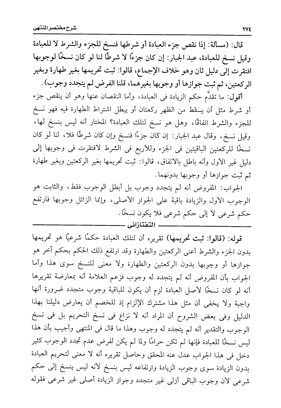 أقول: ما تقدَّم حكم الزيادة فى العبادة، وأما النقصان عنها وهو أن ينقص جزء أو شرط مثل أن يسقط من الظهر ركعتان أو يبطل اشتراط الطهارة فيه فهو نسخ للجزء والشرط اتفاقًا، وهل هو نسخ لتلك العبادة؟ المختار أنه ليس بنسخ لها، وقيل نسخ، وقال عبد الجبار: إن كان جزءًا فنسخ وإن كان شرطًا فلا، لنا لو كان نسخًا للركعتين الباقيتين فى الجزء وللأربع فى الشرط لافتقرت فى وجوبها إلى دليل غير الأول وأنه باطل بالاتفاق، قالوا: ثبت تحريمها بغير الركعتين وبغير طهارة ثم ثبت جوازها أو وجوبها بدونهما.