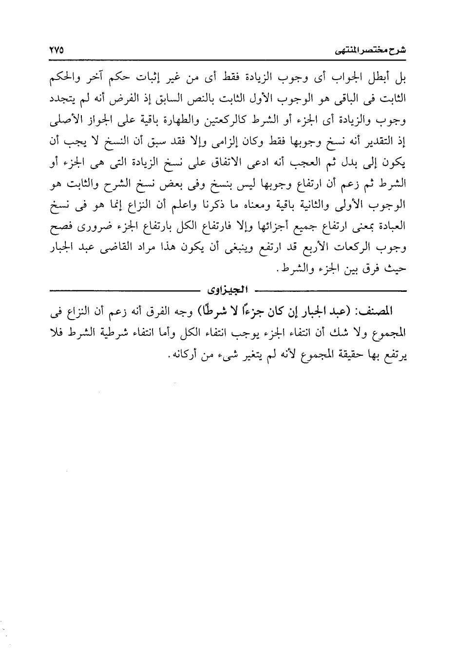 المصنف: (عبد الجبار إن كان جزءًا لا شرطًا) وجه الفرق أنه زعم أن النزاع فى المجموع ولا شك أن انتفاء الجزء يوجب انتفاء الكل وأما انتفاء شرطية الشرط فلا يرتفع بها حقيقة المجموع لأنه لم يتغير شئ من أركانه.