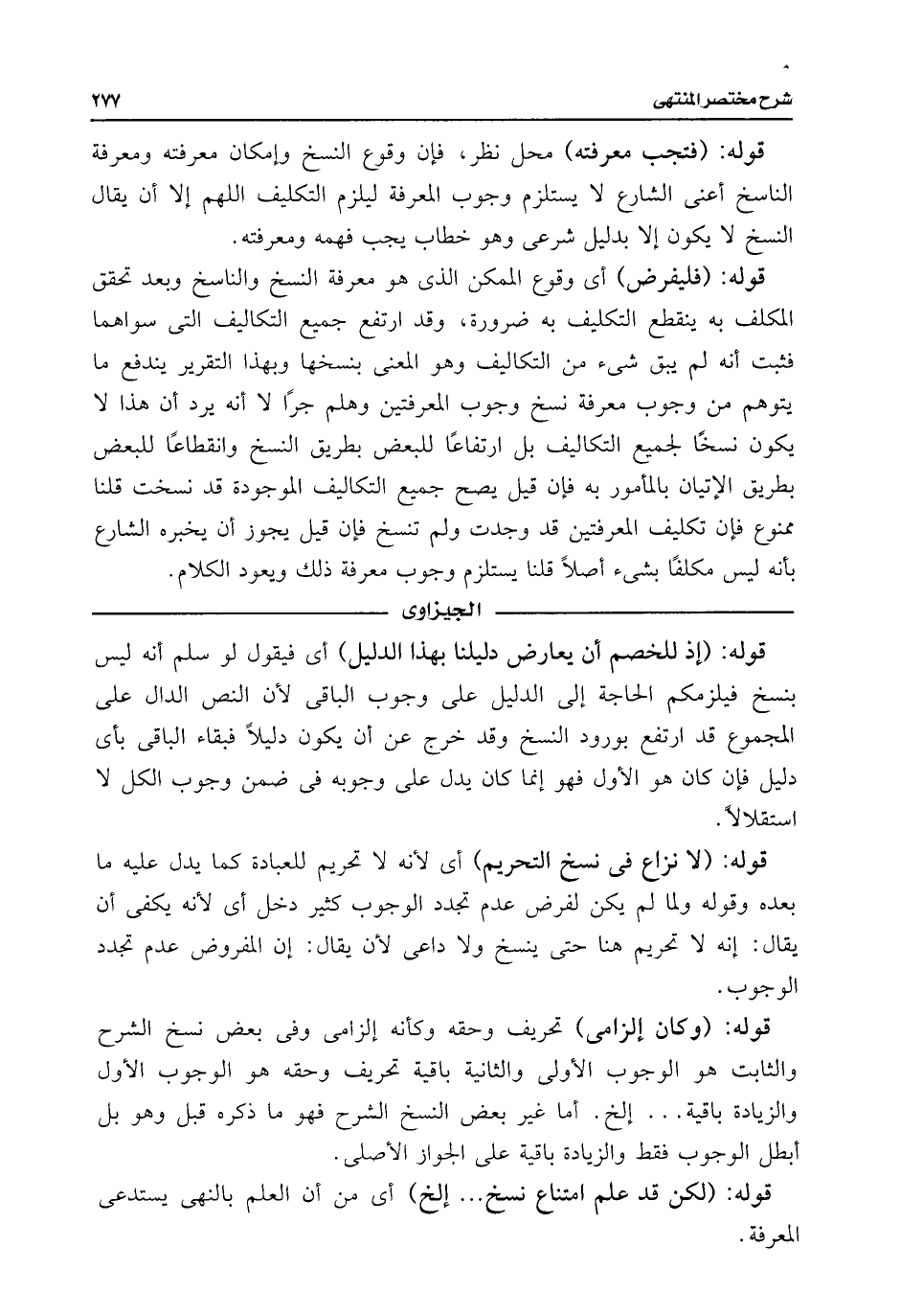 قوله: (فليفرض) أى وقوع الممكن الذى هو معرفة النسخ والناسخ وبعد تحقق المكلف به ينقطع التكليف به ضرورة، وقد ارتفع جميع التكاليف التى سواهما فثبت أنه لم يبق شئ من التكاليف وهو المعنى بنسخها وبهذا التقرير يندفع ما يتوهم من وجوب معرفة نسخ وجوب المعرفتين وهلم جرًا لا أنه يرد أن هذا لا يكون نسخًا لجميع التكاليف بل ارتفاعًا للبعض بطريق النسخ وانقطاعًا للبعض بطريق الإتيان بالمأمور به فإن قيل يصح جميع التكاليف الموجودة قد نسخت قلنا ممنوع فإن تكليف المعرفتين قد وجدت ولم تنسخ فإن قيل يجوز أن يخبره الشارع بأنه ليس مكلفًا بشئ أصلًا قلنا يستلزم وجوب معرفة ذلك ويعود الكلام.