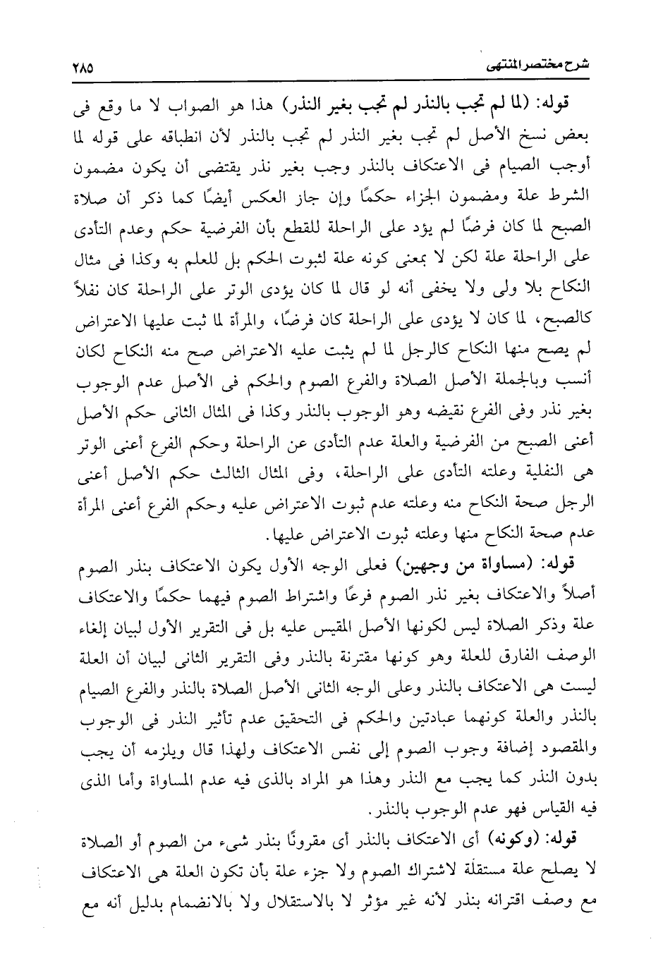 قوله: (لما لم تجب بالنذر لم تجب بغير النذر) هذا هو الصواب لا ما وقع فى بعض نسخ الأصل لم تجب بغير النذر لم تجب بالنذر لأن انطباقه على قوله لما أوجب الصيام فى الاعتكاف بالنذر وجب بغير نذر يقتضى أن يكون مضمون الشرط علة ومضمون الجزاء حكمًا وإن جاز العكس أيضًا كما ذكر أن صلاة الصبح لما كان فرضًا لم يؤد على الراحلة للقطع بأن الفرضية حكم وعدم التأدى على الراحلة علة لكن لا بمعنى كونه علة لثبوت الحكم بل للعلم به وكذا فى مثال النكاح بلا ولى ولا يخفى أنه لو قال لما كان يؤدى الوتر على الراحلة كان نفلًا كالصبح، لما كان لا يؤدى على الراحلة كان فرضًا، والمرأة لما ثبت عليها الاعتراض لم يصح منها النكاح كالرجل لما لم يثبت عليه الاعتراض صح منه النكاح لكان أنسب وبالجملة الأصل الصلاة والفرع الصوم والحكم فى الأصل عدم الوجوب بغير نذر وفى الفرع نقيضه وهو الوجوب بالنذر وكذا فى المثال الثانى حكم الأصل أعنى الصبح من الفرضية والعلة عدم التأدى عن الراحلة وحكم الفرع أعنى الوتر هى النفلية وعلته التأدى على الراحلة، وفى المثال الثالث حكم الأصل أعنى الرجل صحة النكاح منه وعلته عدم ثبوت الاعتراض عليه وحكم الفرع أعنى المرأة عدم صحة النكاح منها وعلته ثبوت الاعتراض عليها.